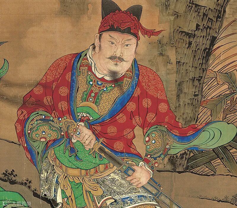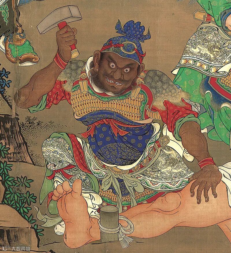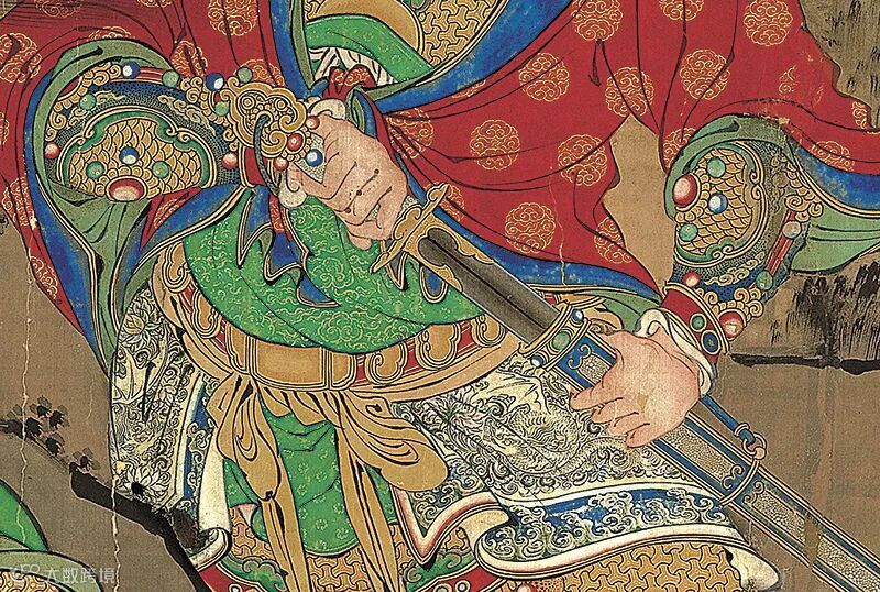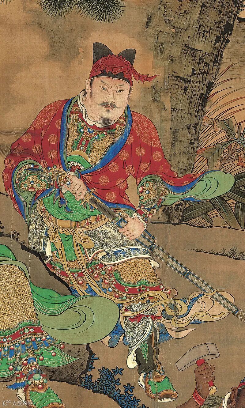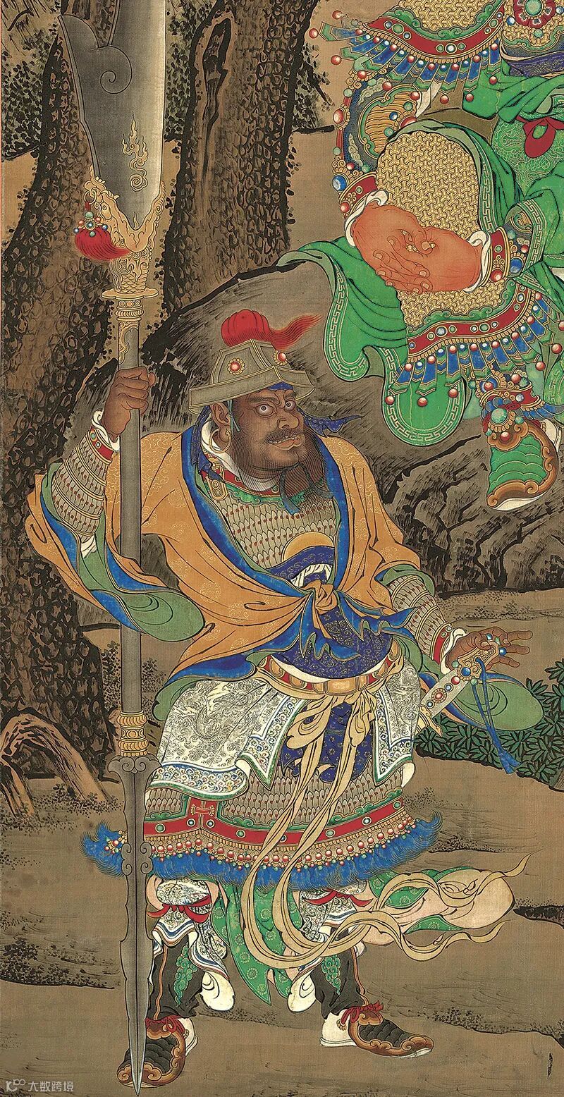 右边站立一黑脸猛将,手持关公的青龙偃月刀,此人当是周仓。