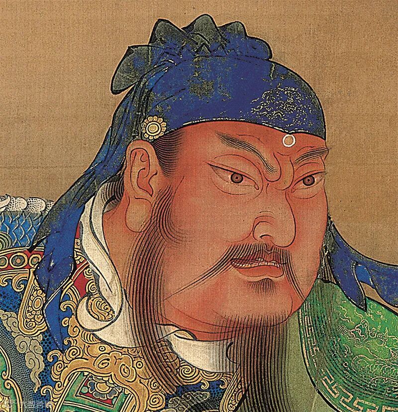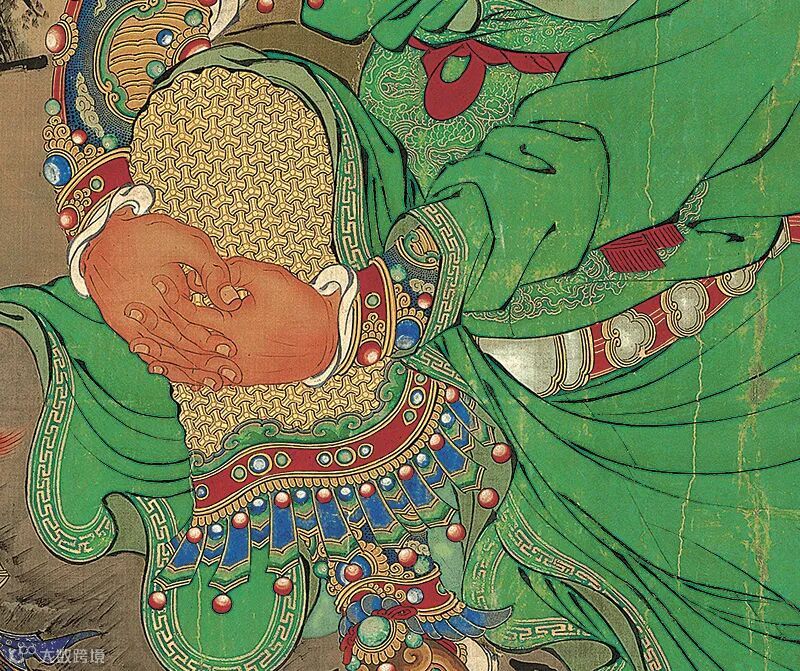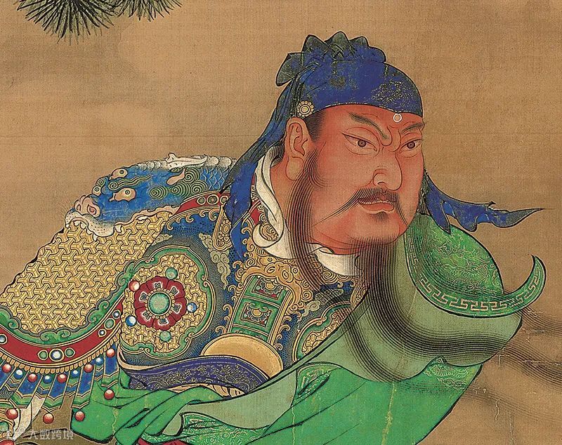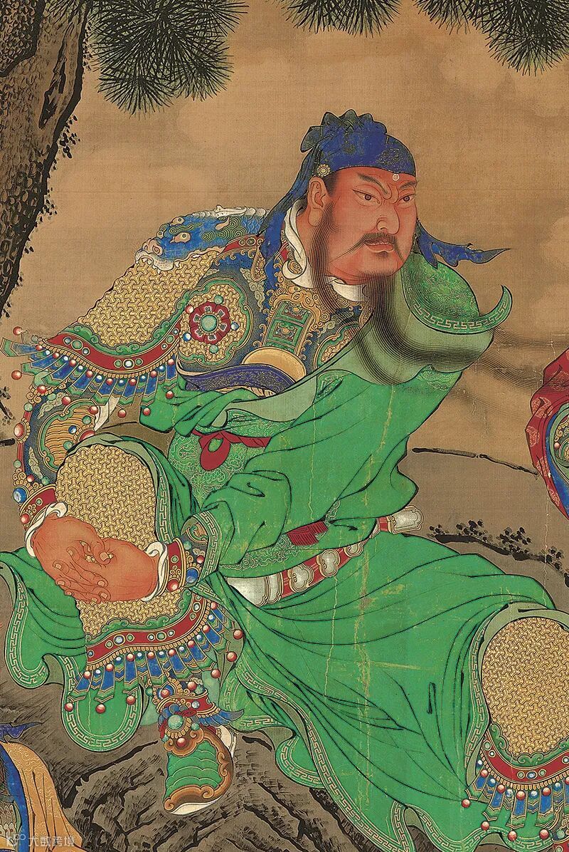 画面上,关羽正侧身坐在山谷高台上,他伟躯长髯,赤面凤眼,全身披甲,气字轩昂,一副凛然正气。
