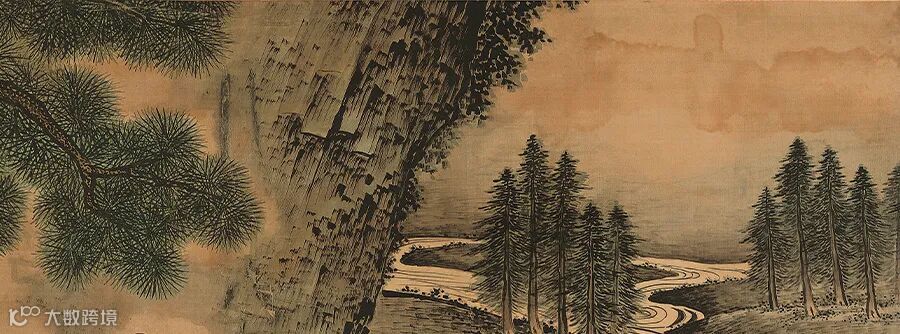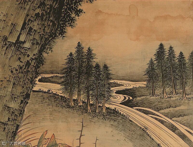 人物后面的背景是一处险隘山谷。近处山崖高耸,远处山川回环。山石采用大斧劈皴,颇具南宋马远、夏珪笔意,但变得更加挺健豪放。