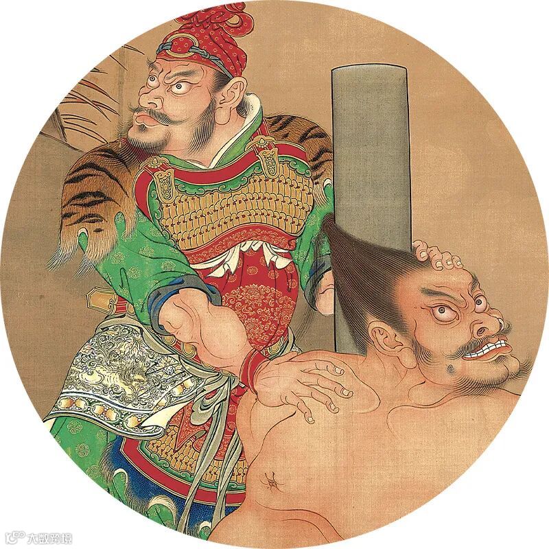 敌将虽然十分狼狈,但他不甘降服,圆睁双目,使劲扭动身躯,致使肌肉紧绷,表现出势不两立的神情。
