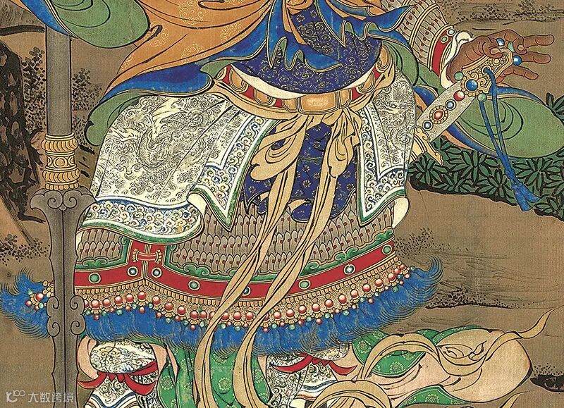 人物高大,神情逼真,衣纹线条刚劲有力,笔势飞动,繁密流畅。整个画面,色彩鲜明浓重,施用红、绿色与金粉,具有壁画特色。