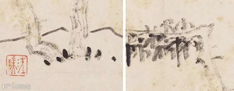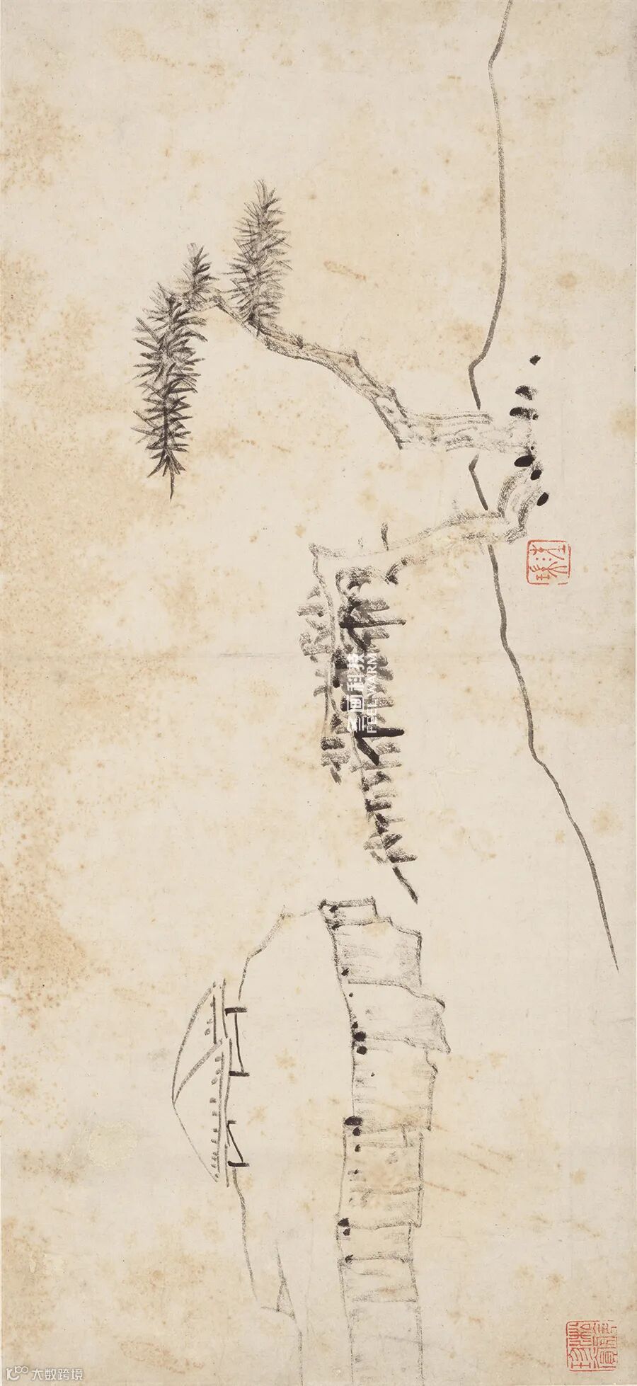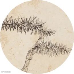 “坡岸”那根长线属圆线,悬腕中峰,于原作中映视之,可以见到线的中间有更浓的一丝痕迹,象圆柱的中轴,圆浑感极强,这就是前人最乐称道的“绵里针”,篆书笔意。他画的松树干和杂树叶用的是方笔,但决不是一味的扁平,线的两沿黑,中间平,且有一丝或数丝飞白,前人称此“如垩墙,倒提其刷按之下”,“如击敌,深入敌后反击之”。