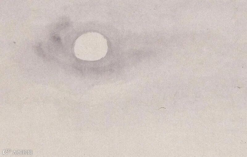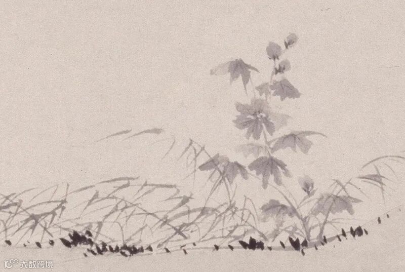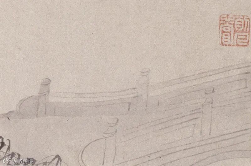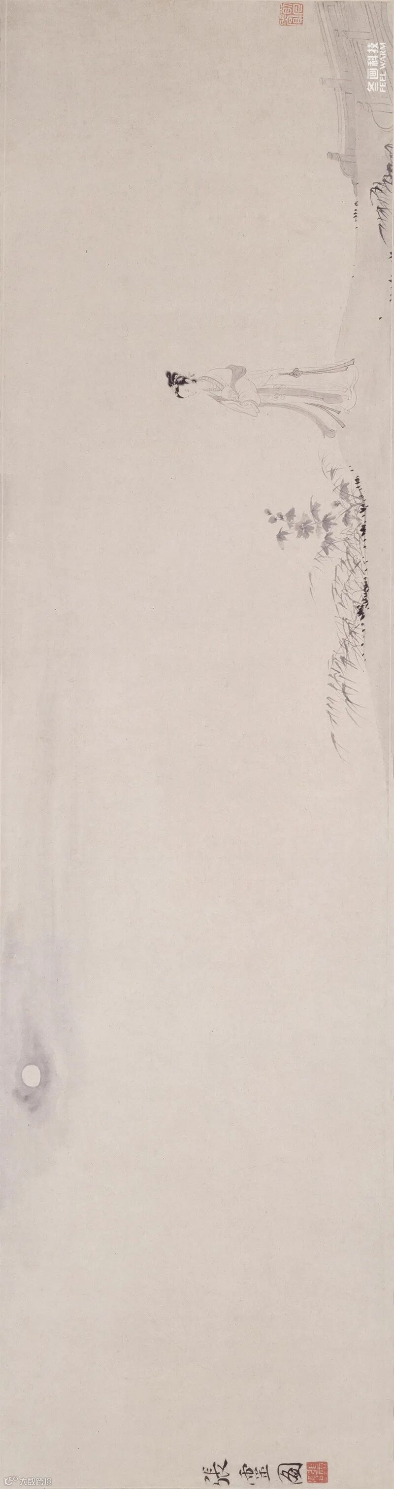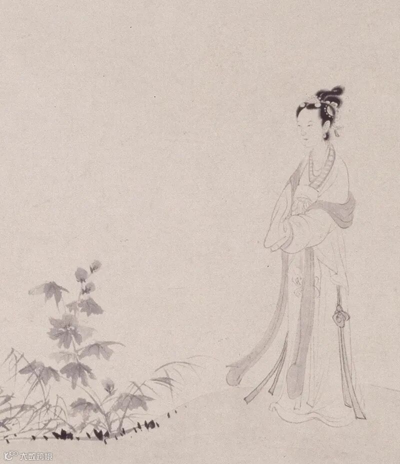 景物描绘极其概略,以意笔写之,更注重在大面积的留白中寄寓深邃的意境。水际的野花芦草疏疏落落、参差披离,淡青色的天幕上新月高悬,月光映照着少女的倩影,衬托出她的皎洁之质和思恋之情。