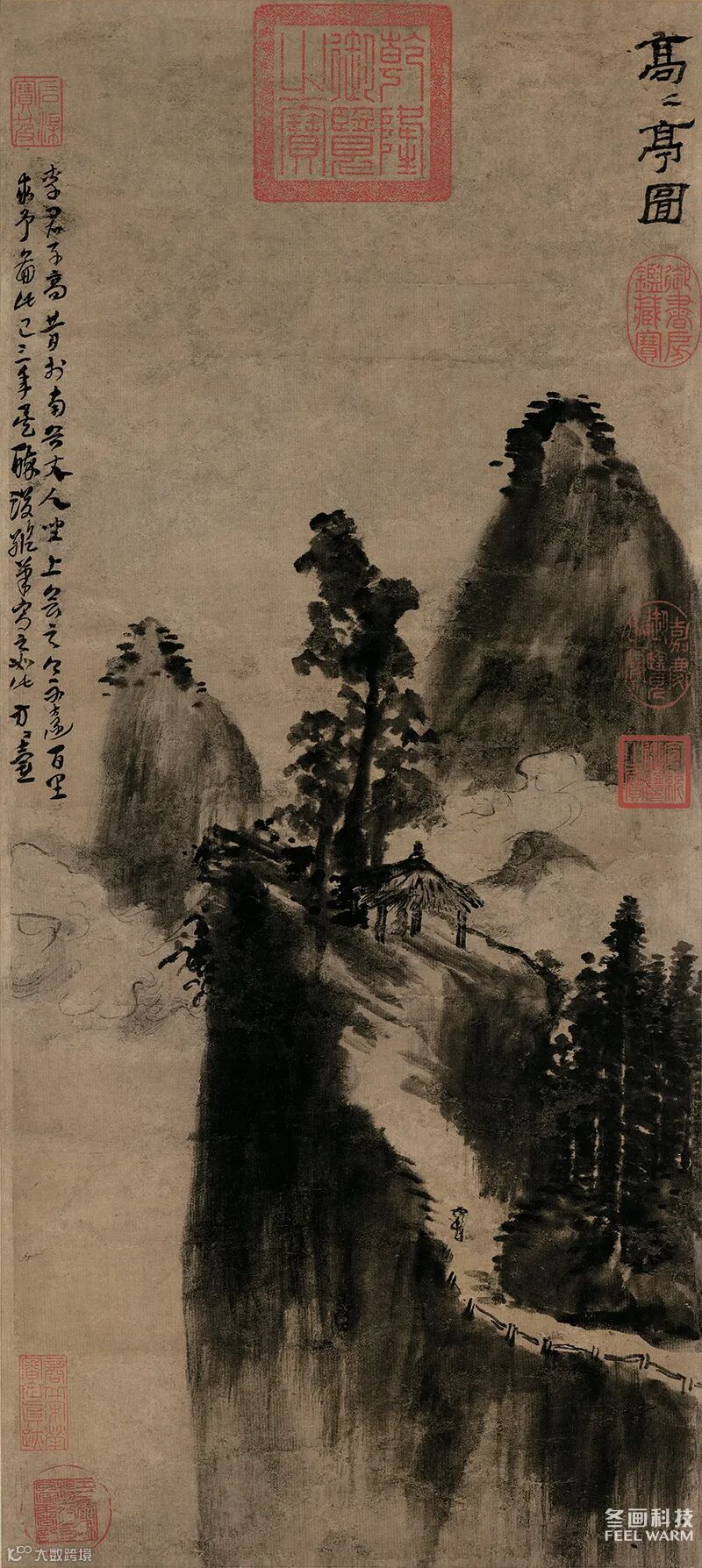 自题“高高亭图”,又题“李君子高昔于南谷丈人座上会之;今不远百里求余图此已三年矣。醉后纵笔写之如此。方方壶。”便知这幅画是方从义的酒后之作,难怪每一笔都醉意浓浓。