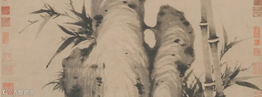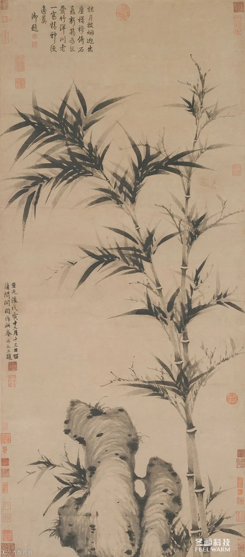 画的右侧绘出两竿茂竹,左下方两方怪石依竹而立,外侧一方较大,上缀若干小草。