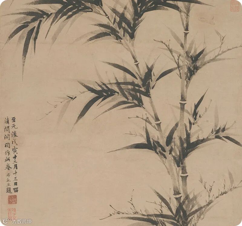 除《墨竹轴》外,柯九思还有纸本《双竹图轴》传世。该作画两株竹斜人空中,寥寥数笔,浓淡得体,显得含蓄有致。