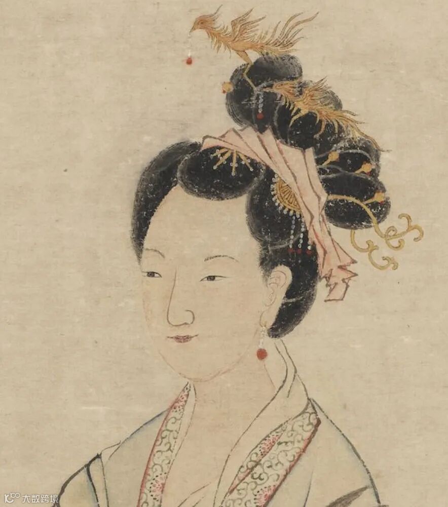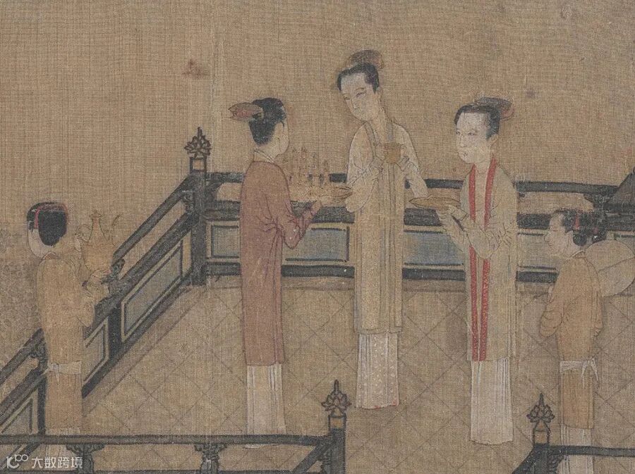 旁立侍女三人,或临案焚香,或捧奁,或荷琴,神情庄严静穆。