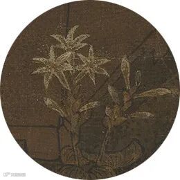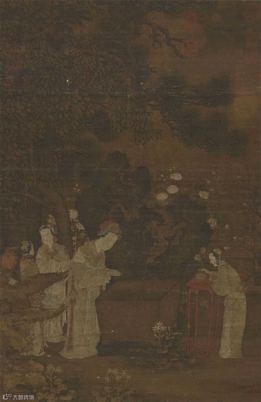 此幅画明月皎洁,高挂天际。庭院深处,高植著虬松、梧桐与芭蕉,枝叶苍郁欣茂,地面另有芙蓉、蜀葵、雏菊等花卉,竞吐芳香。奇石上盘踞的蟠螭,正低伏泻水,池中波纹荡漾。