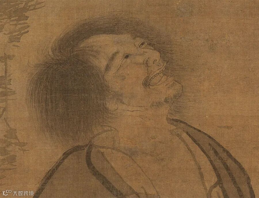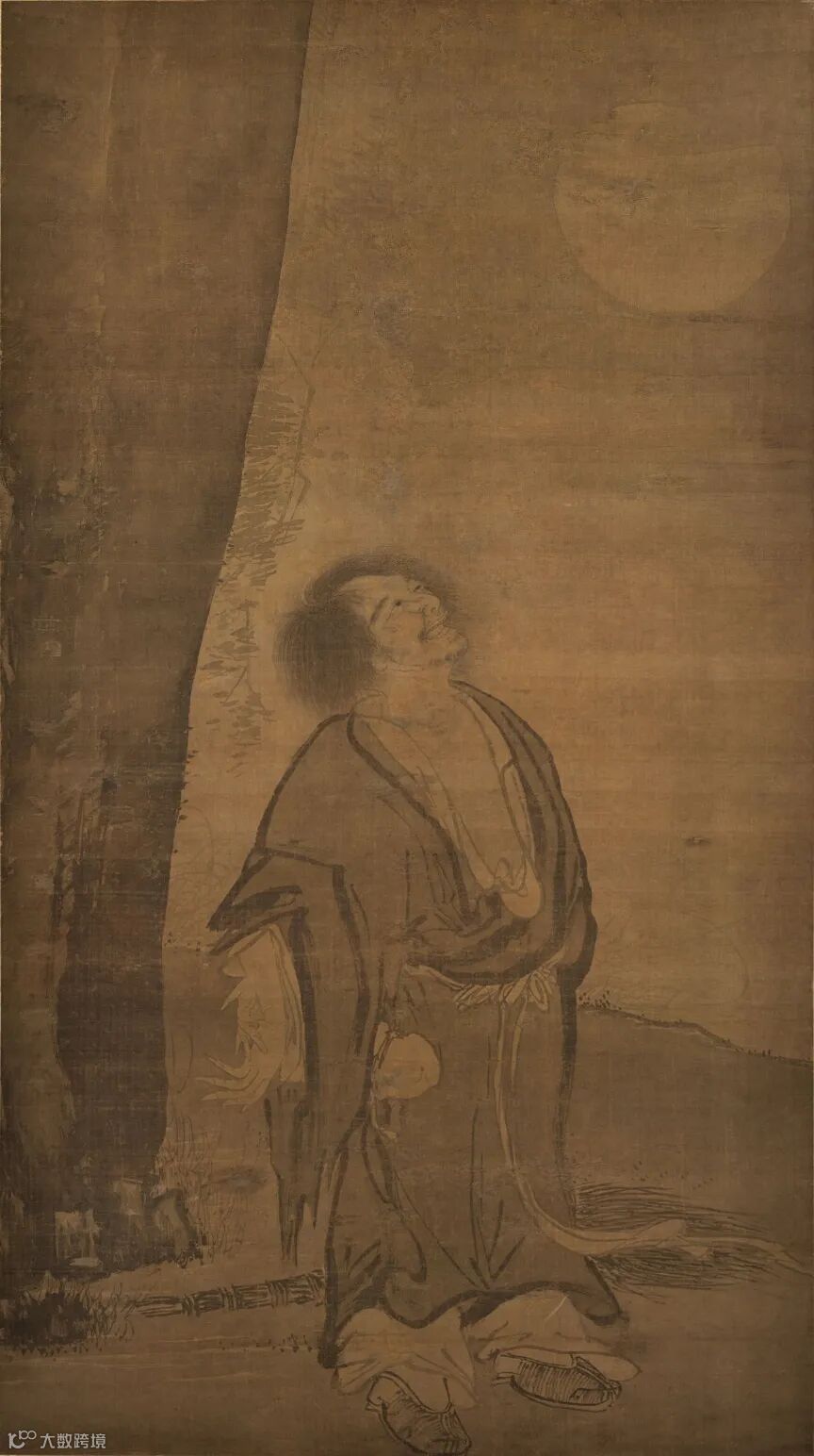 此图绘唐天台山国清寺僧拾得对月痴笑情景,面部刻画入神,衣纹用笔潇洒不羁中皆中转折之肯綮,大沷墨的山石树藤,非浙派高手不能为,所以定为张路所画亦在情理中。