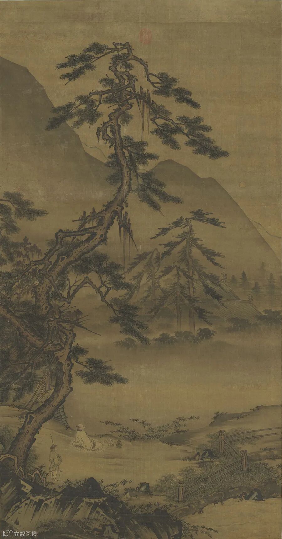 本幅写松荫下,高士独坐对月。林间,曲水绕栏,薄雾掩映,一派宁谧之气,溢于画表。右下角石隙,虽署有「马远」款,但就画风论,应出自传承马夏流派的明人之手。