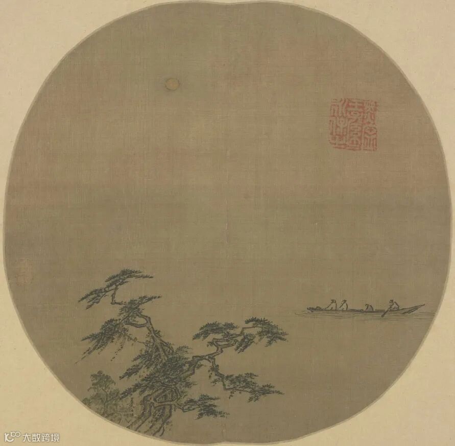 宋代画家似乎有恋月情结,不仅画月,还喜欢把画作制成如明月般的团扇形制,被后世喻为“宋朝的明月”。比如南宋四家中的夏圭画有一幅《松溪泛月图》,即是团扇形制,仅画一松一舟一月,四人划船,荡舟月下,意趣盎然。