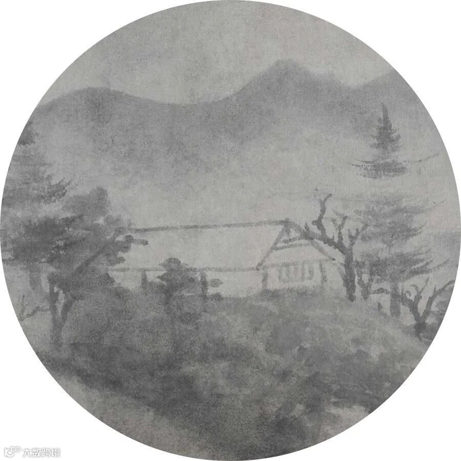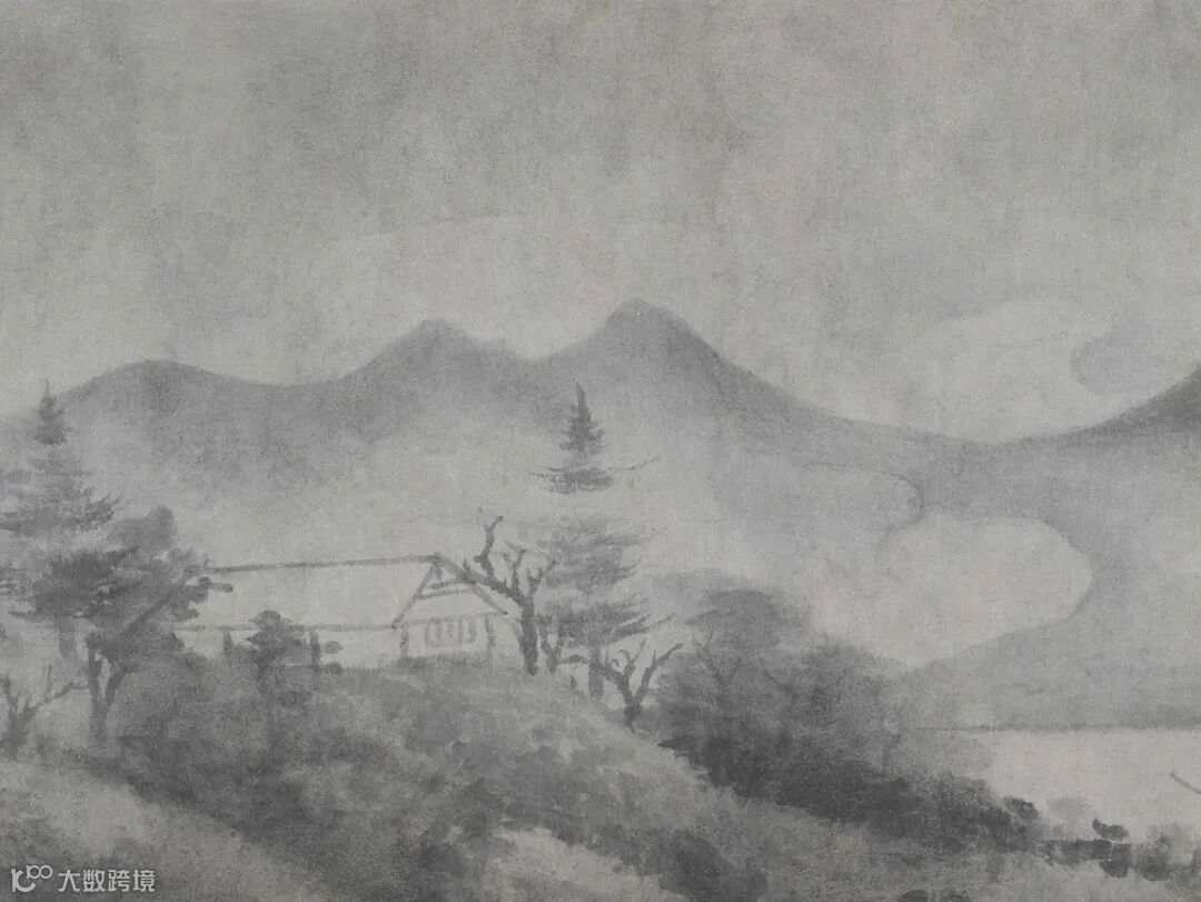 结尾处山色又渐趋淡远,唯近处林岸、草庐明晰。自首至尾,迷濛、清明以及远近、浓淡,几度变幻,奥妙莫测。时隐时显,忽明忽晦,迷濛又富有变化。同时他也很讲究笔法,以大笔触的遒劲笔法来泼染水墨,墨随笔走,在大笔涂染块面中,多有纵点、横点、落茄点和不规则的破笔点,亦见连勾带擦的线条。