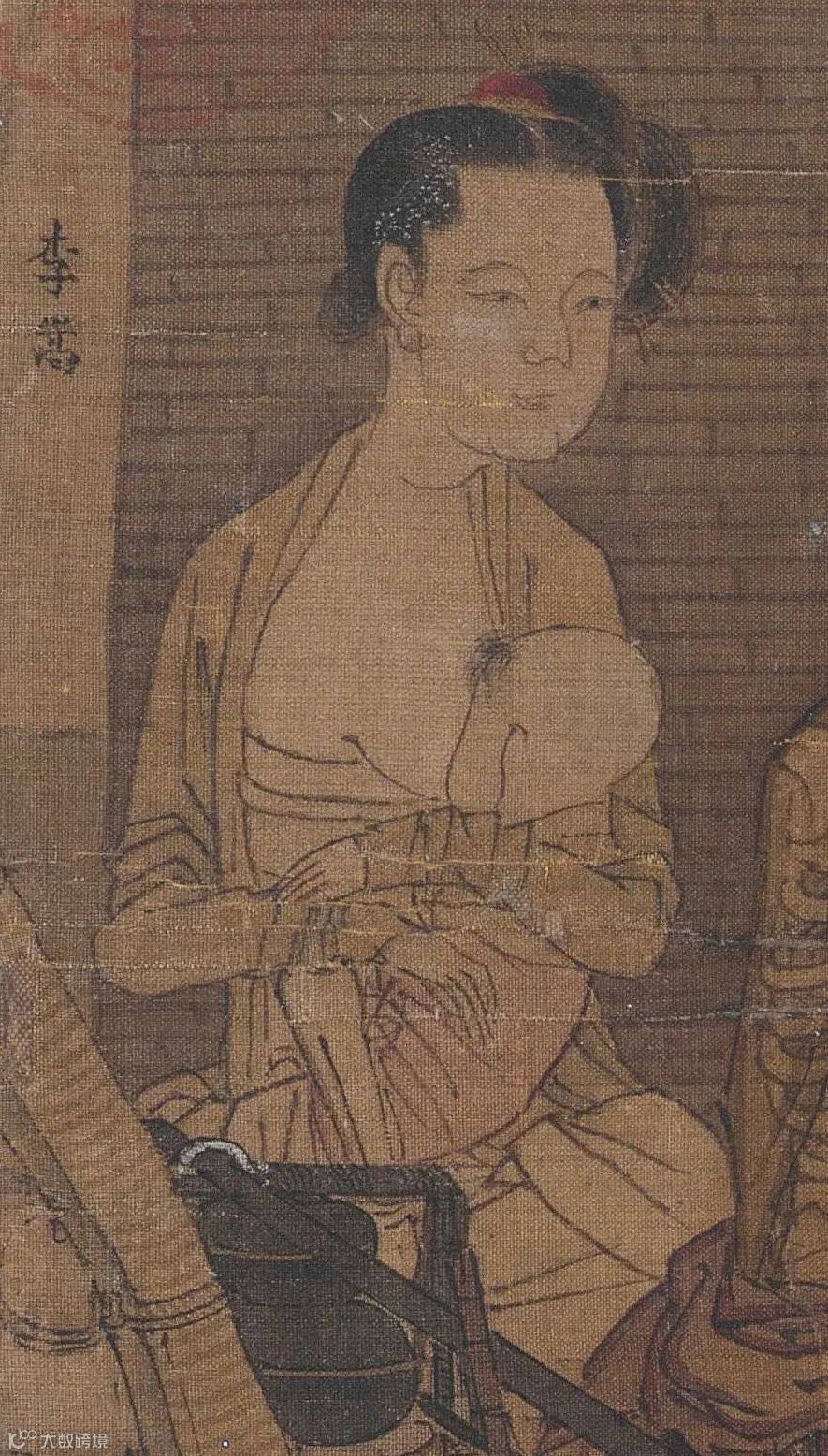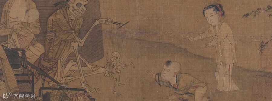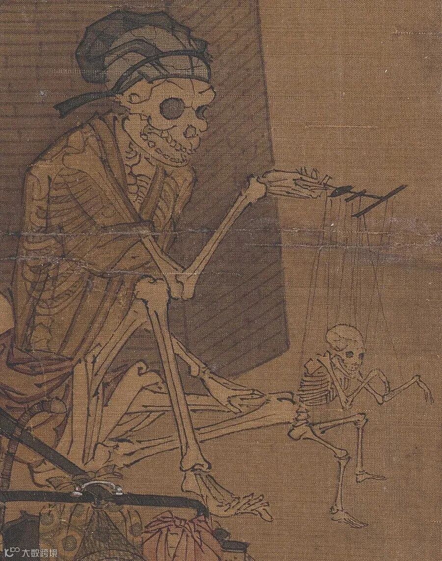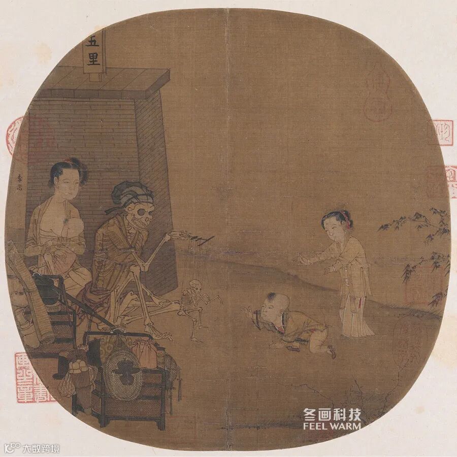 大骷髅身後,一妇人袒胸露乳,喂哺幼儿,神色不安地注视着骷髅戏婴之情景,与画幅右边神情恐惧、伸手阻拦那趴地小儿的另一妇人恰成对照,呈现一种静与动、思与行的对立。