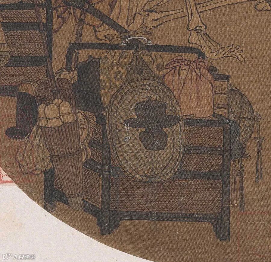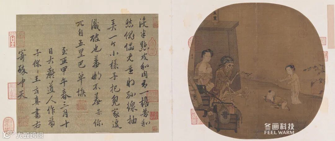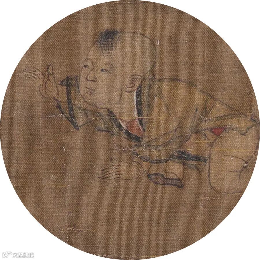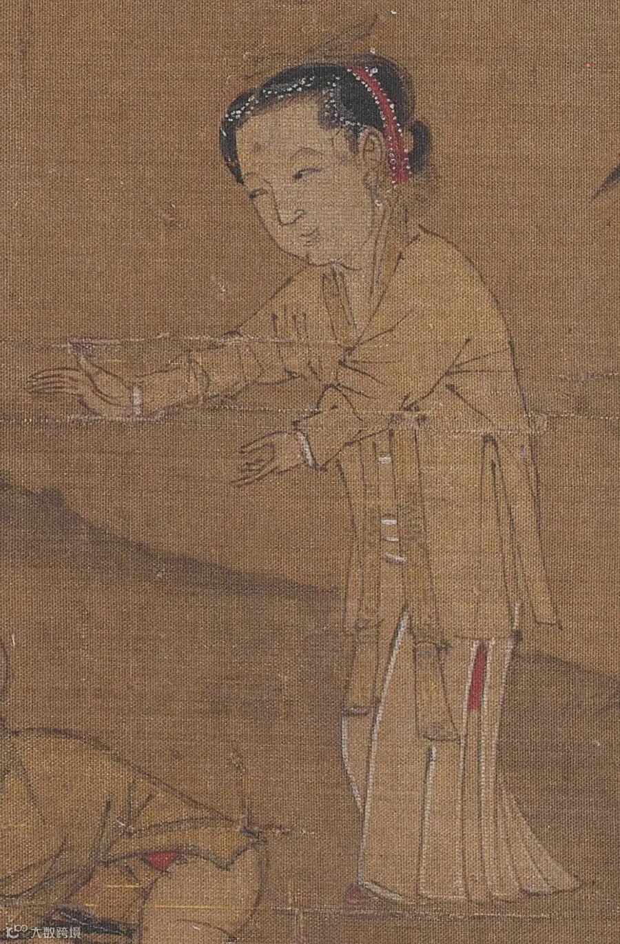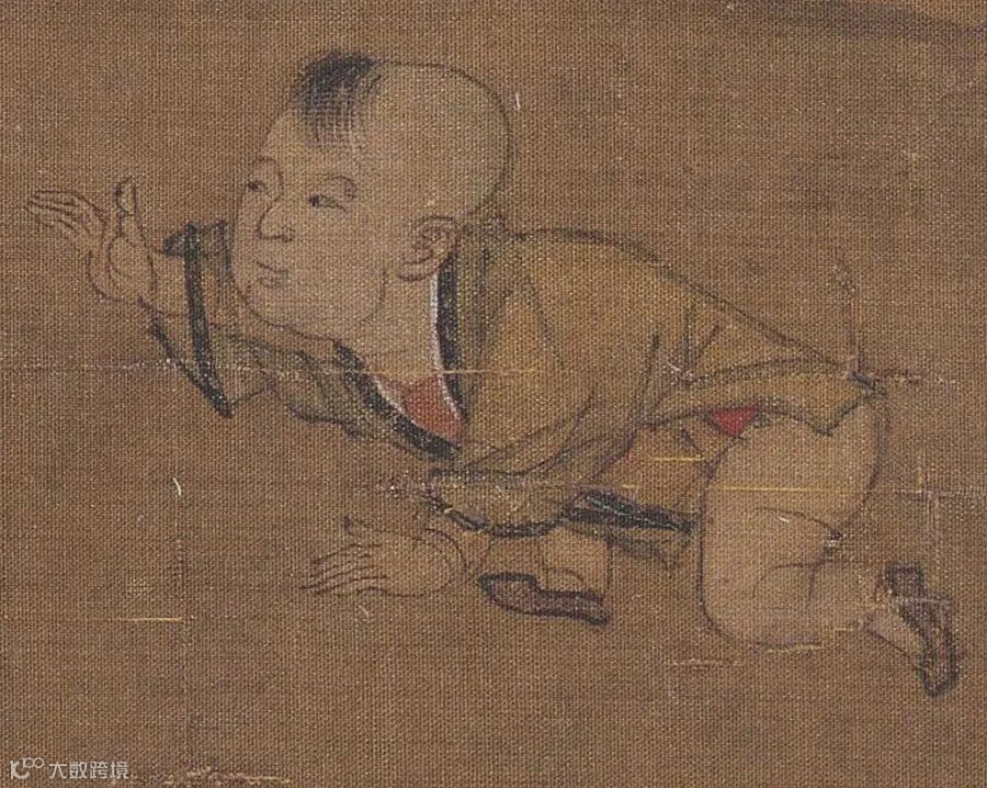 大骷髅身後,一妇人袒胸露乳,喂哺幼儿,神色不安地注视着骷髅戏婴之情景,与画幅右边神情恐惧、伸手阻拦那趴地小儿的另一妇人恰成对照,呈现一种静与动、思与行的对立。