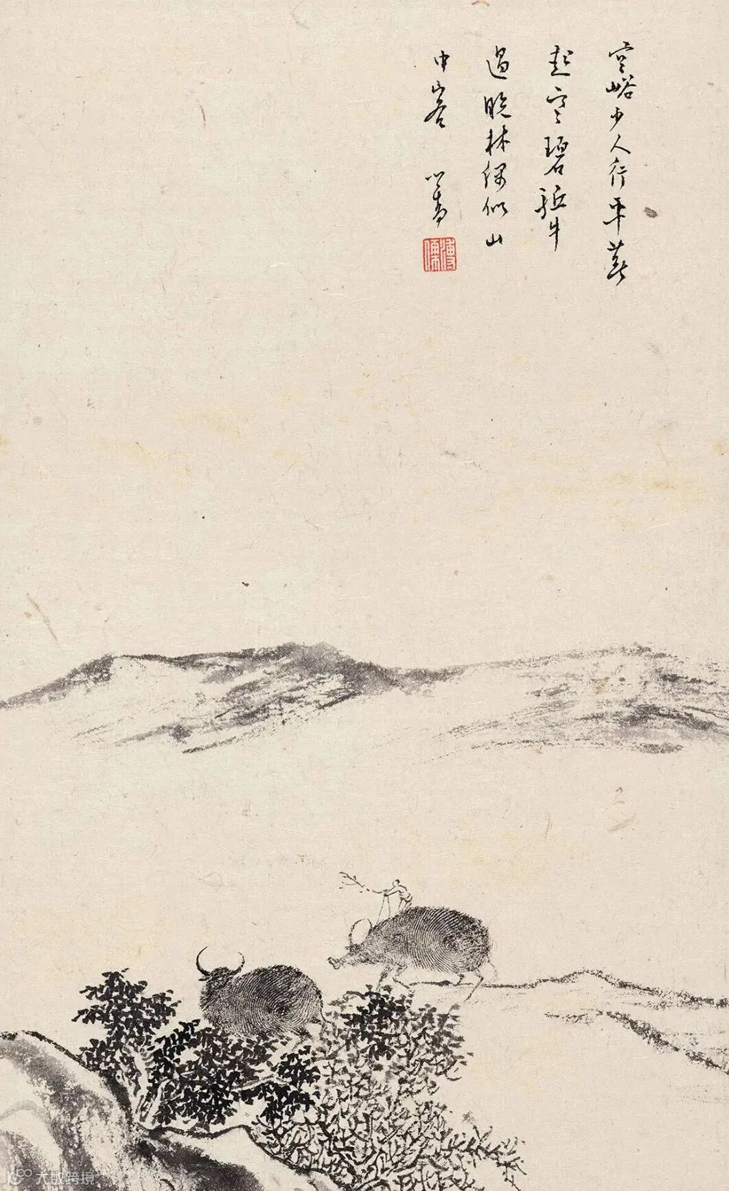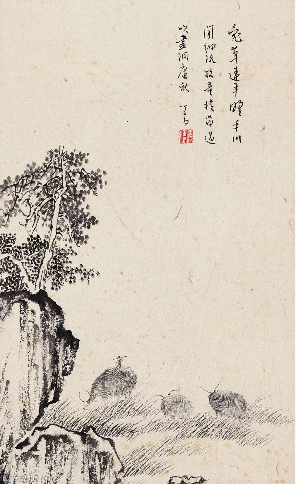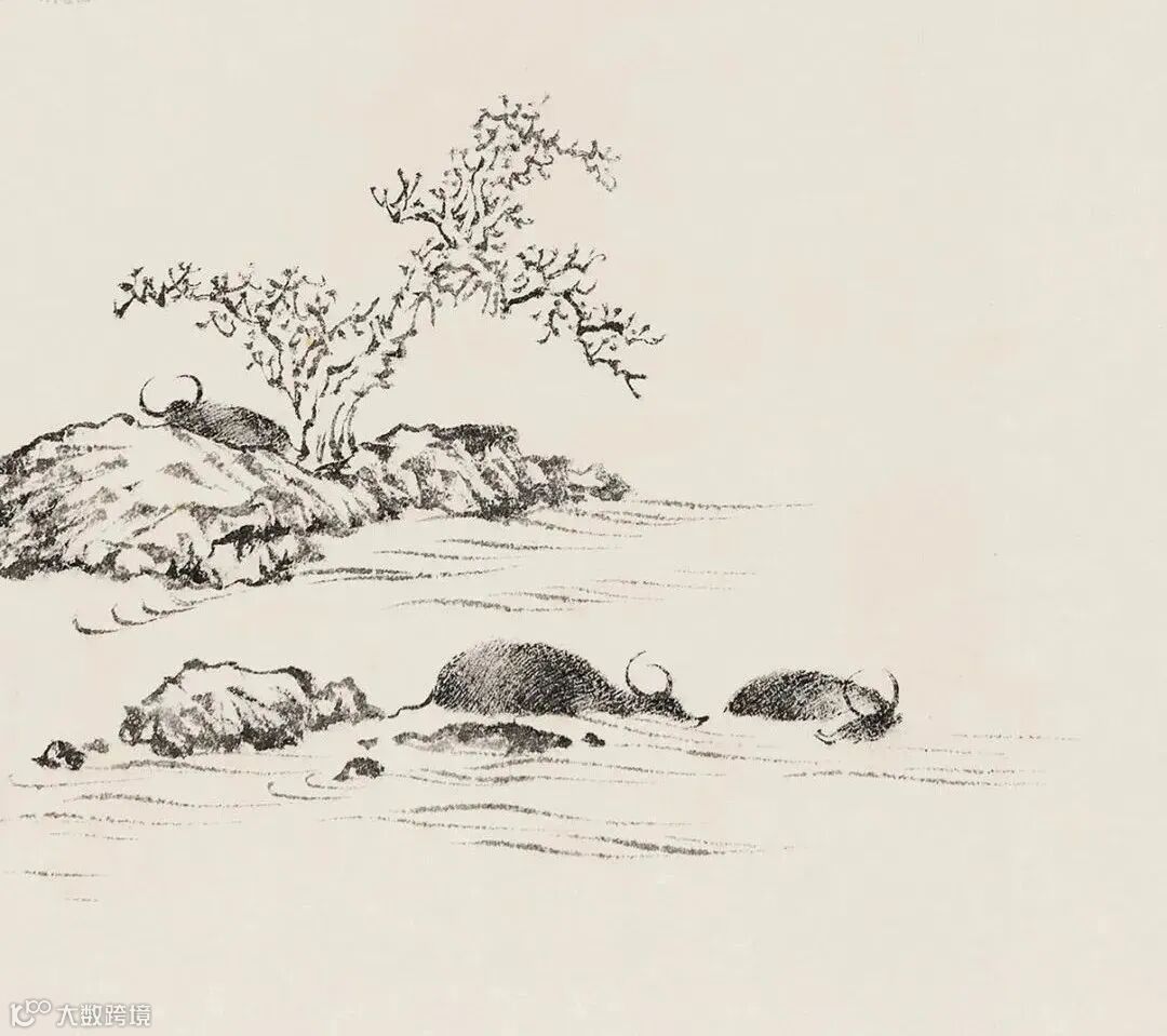 荣宝斋旧藏的溥儒《指纹牛》册页,别出心裁地以指纹建构牛的身体,以笔墨补足四肢及头部,姿态各异,或俯首而行,或凫水而游,或回收漫步,或低头吃草,于小趣中见大雅,天趣自生。