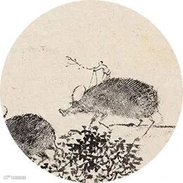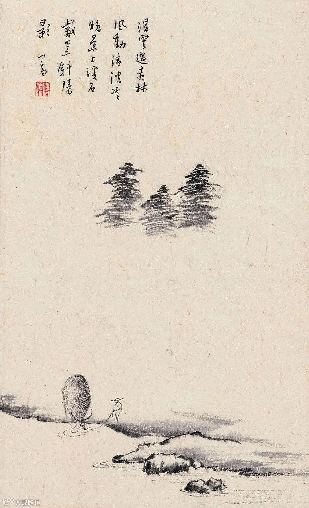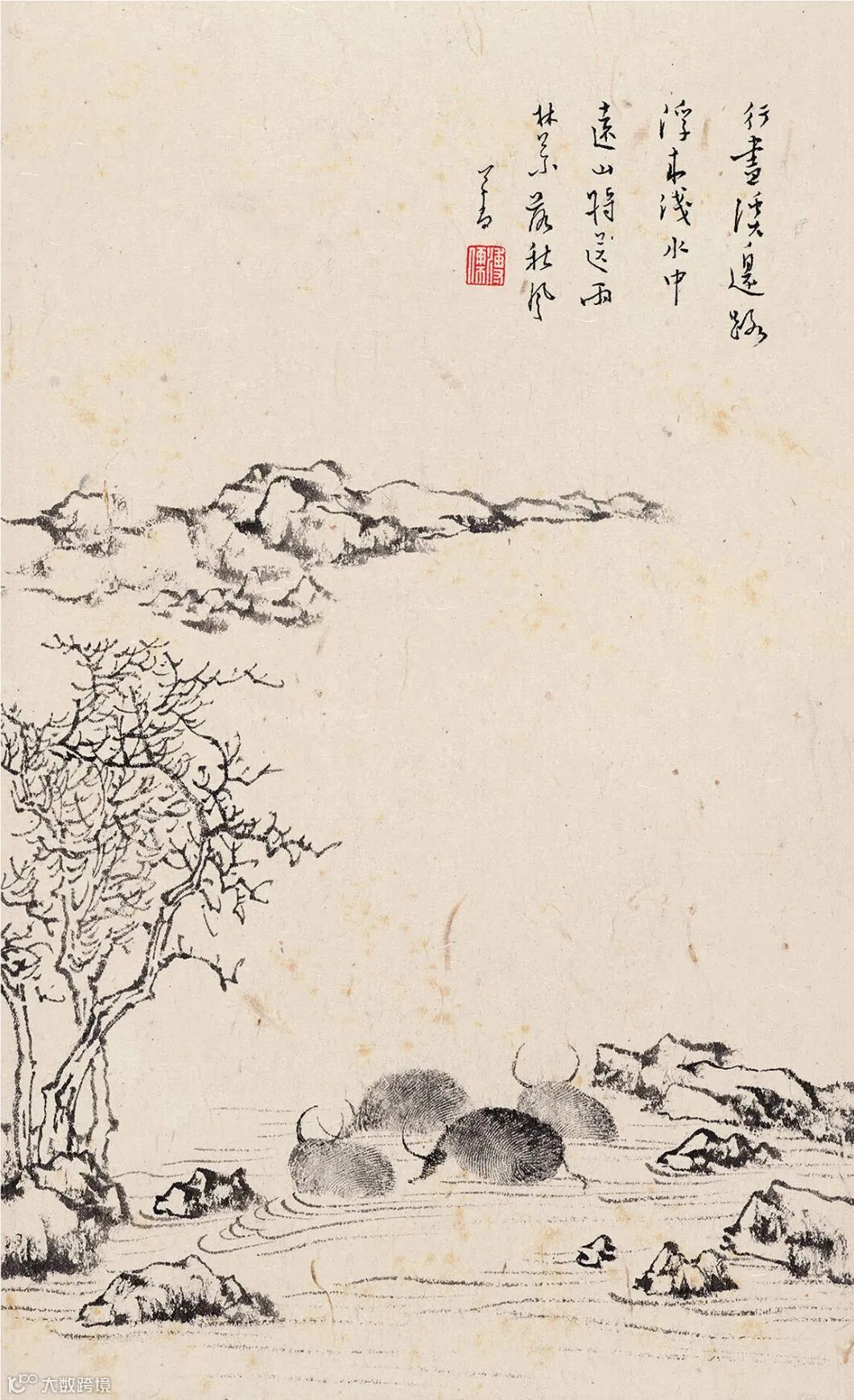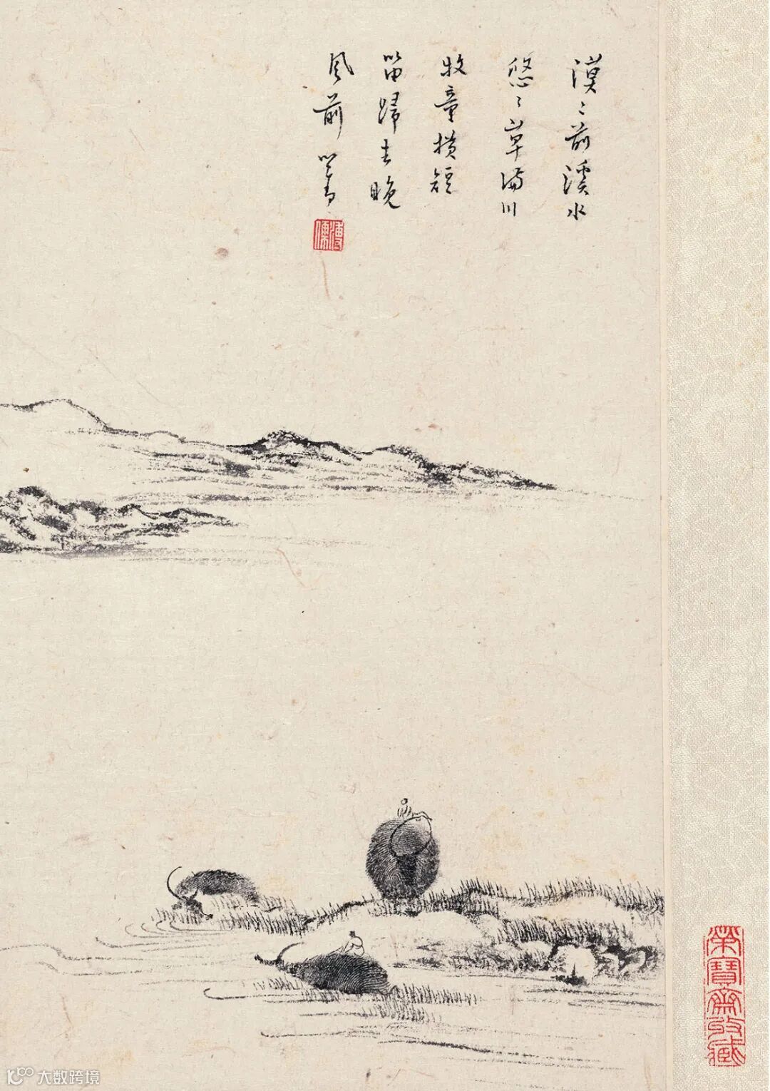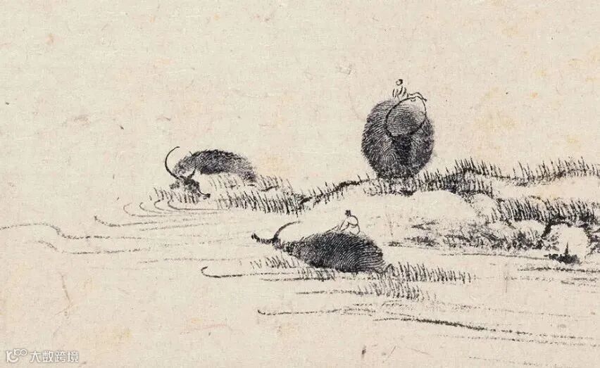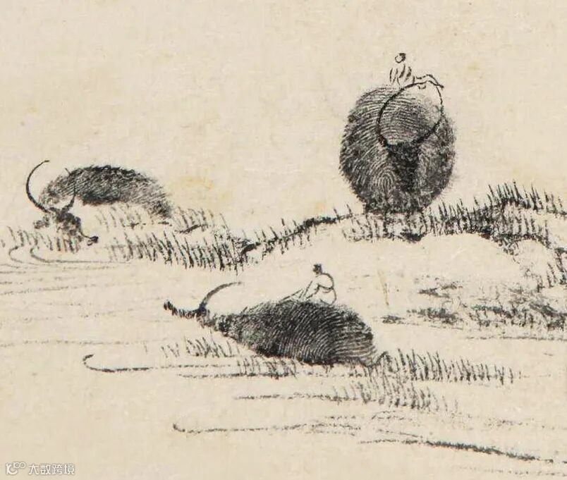 这套六开册页,皆绘牧童放牛,在浓淡、形状不同的指纹上,补绘四肢、头尾,栩栩如生的水牛形象便跃然纸端,或行或立、或站或卧、或在水、或立坡不一而足。而指腹之螺纹亦将水牛身体结构、皮毛、肌理展露无遗,惟妙惟肖,奇趣横生,非有高超想象力者不能为。
