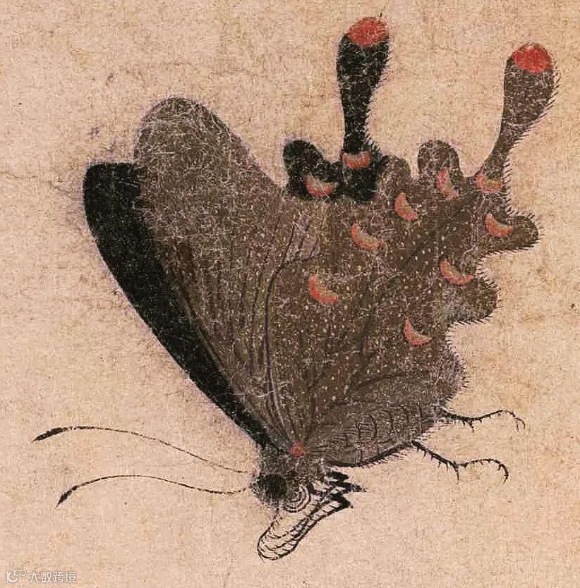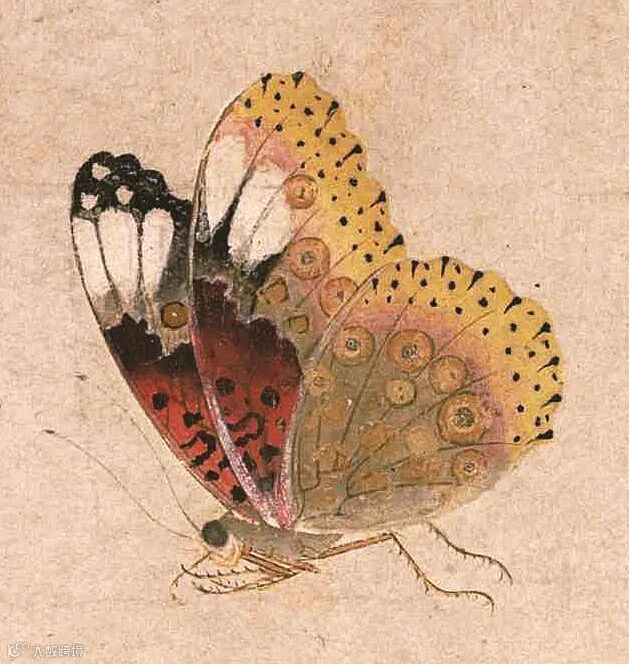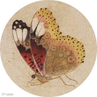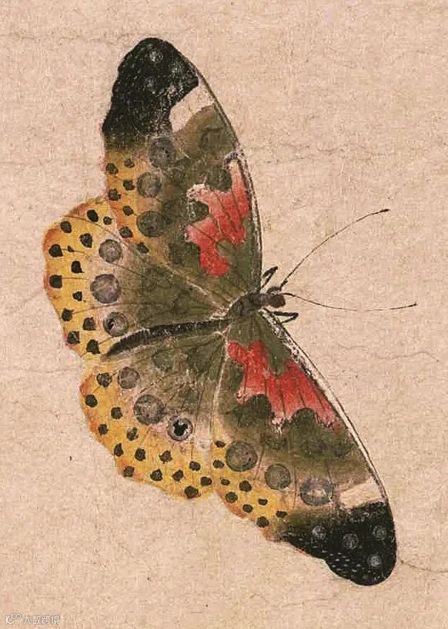 图中蛱蝶的形象最为传神,作者逼真地刻画了蛱蝶之翼薄如绢纱的质感、绚丽斑斓的花纹和蛱蝶细如发丝的根根须脚。传神的笔墨展示了作者深厚的写生功底,使本图成为研究古代蝶种的形象资料。作者不愧有“写生赵昌”的美誉。