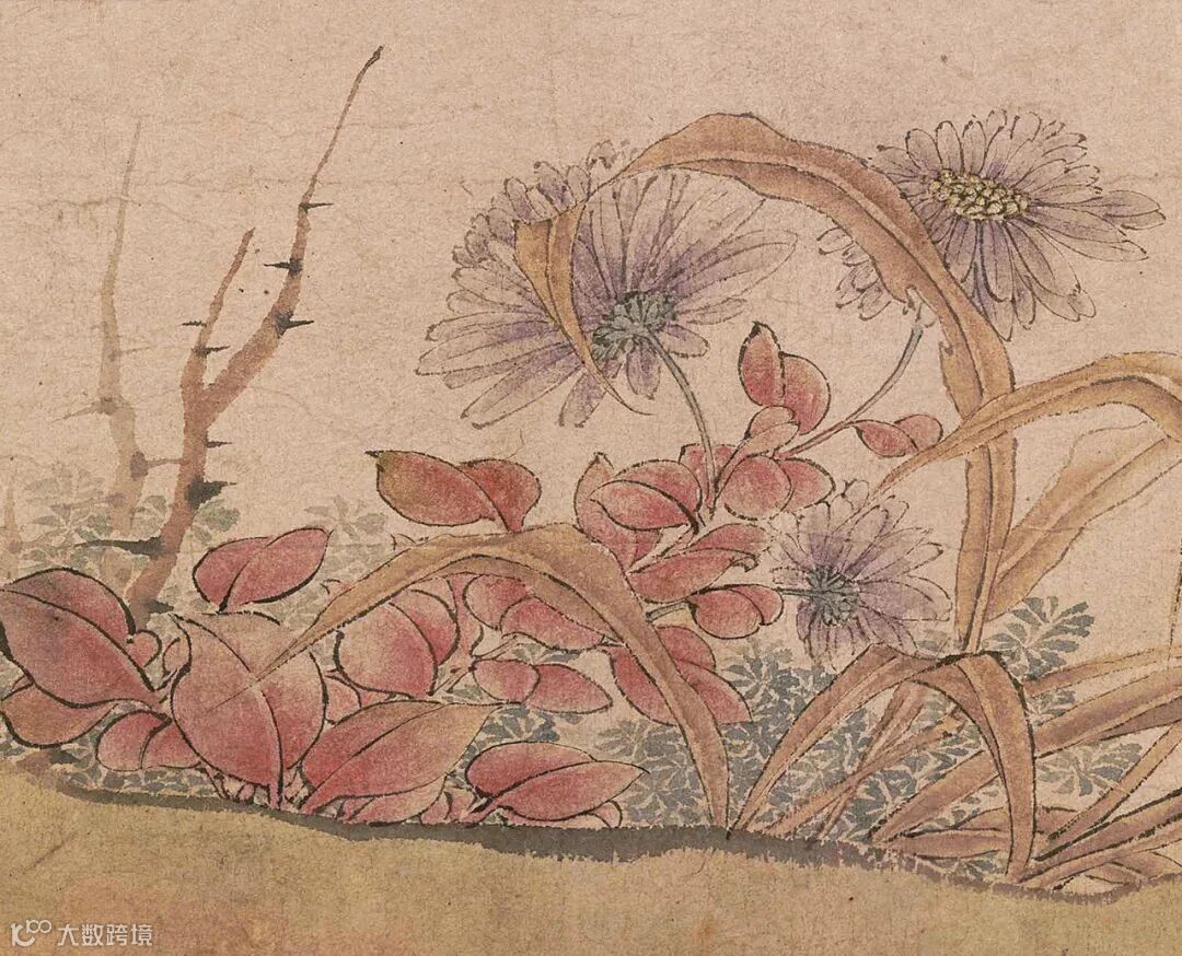 作者用双勾填色法画土坡、草丛、蛱蝶。其勾线富于顿挫和粗细变化,墨色亦有浓淡轻重之分,敷色积染多层,特别是蛱蝶的翅翼更因积染而色彩浓艳厚重。