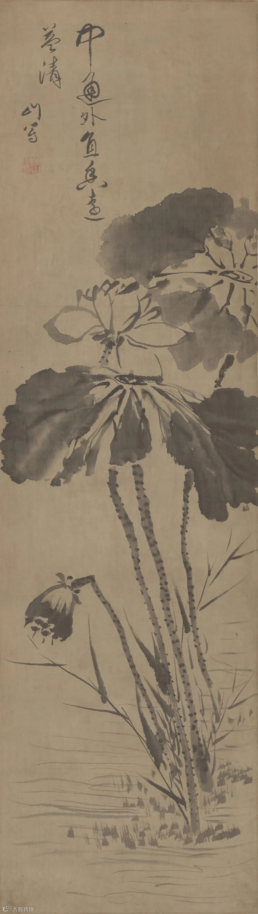 图中写暮秋池塘,以“泼墨法”放笔作荷叶数茎,墨色浓郁,水气淋漓。以细笔中锋勾写荷花、莲蓬,形简意赅,婆娑生姿,颇具枯秀韵致。下方画溪流潺湲,细苇汀草,一派恬静景象。幅上题句取自周敦颐《爱莲说》,借此突出了作者以荷花自况,高蹈磊落的风范。