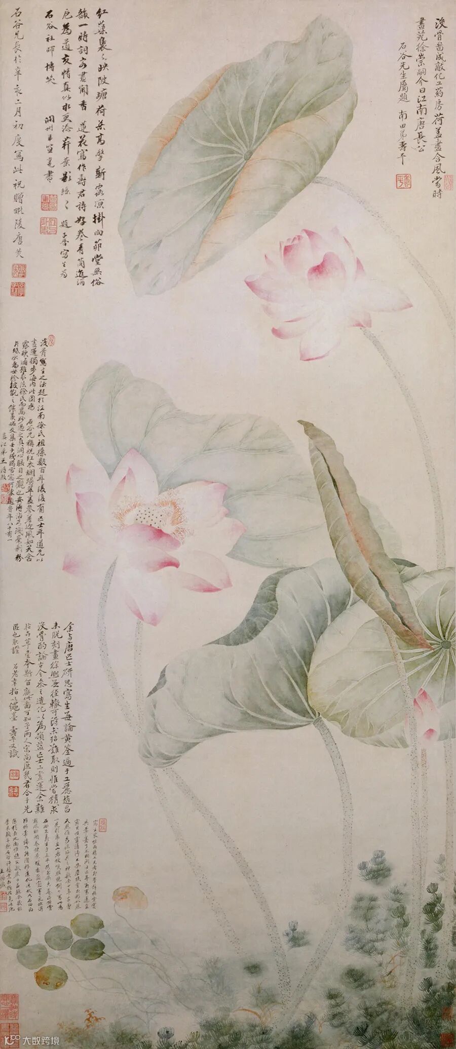 《红莲绿藻图》轴,清康熙十年(1671年),唐炗、恽寿平绘,纸本,设色,纵135.7厘米,横59厘米,故宫博物院藏。