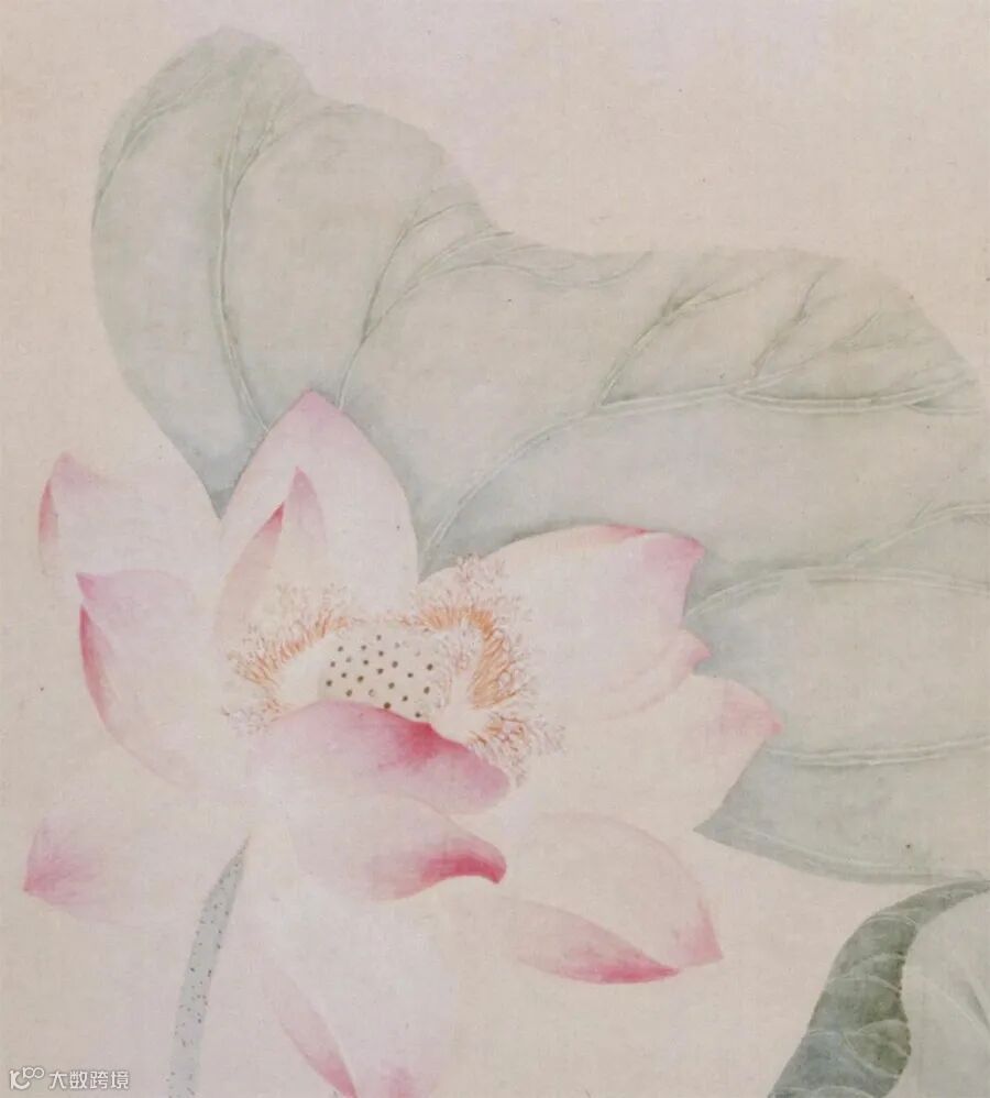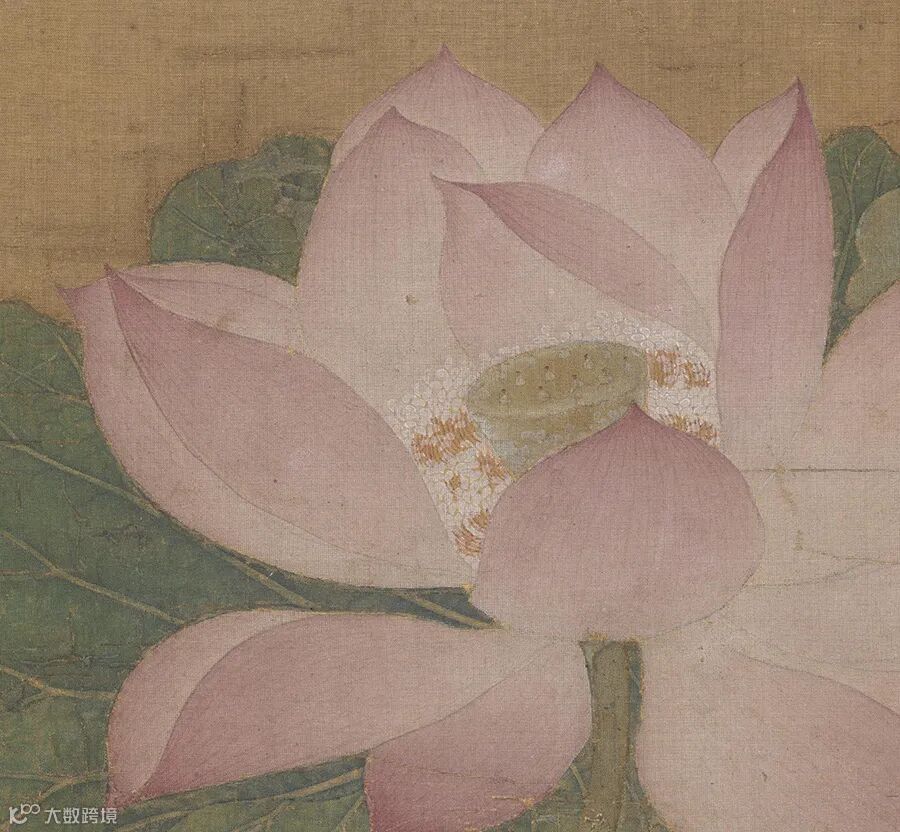 莲瓣的描绘技法类似后世的“没骨”法,不见勾勒之迹,渲染出花瓣既轻盈又腴润的质感。画家的写实功力极为扎实,每片莲瓣的形状、角度、色泽和光感都安排得无懈可击。至于瓣上红丝、蕊端腻粉,也一一仔细料理,微妙之处,使人叹为神工!