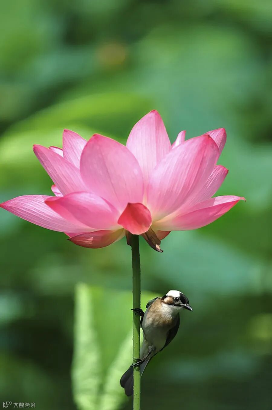 一朵盛开的粉红色荷花占据整个画面,在碧绿的荷叶映衬下抢眼而夺目,布局、设色端庄大气,将荷花“出淤泥而不染,濯清涟而不妖”的君子气质表现得十分完美。