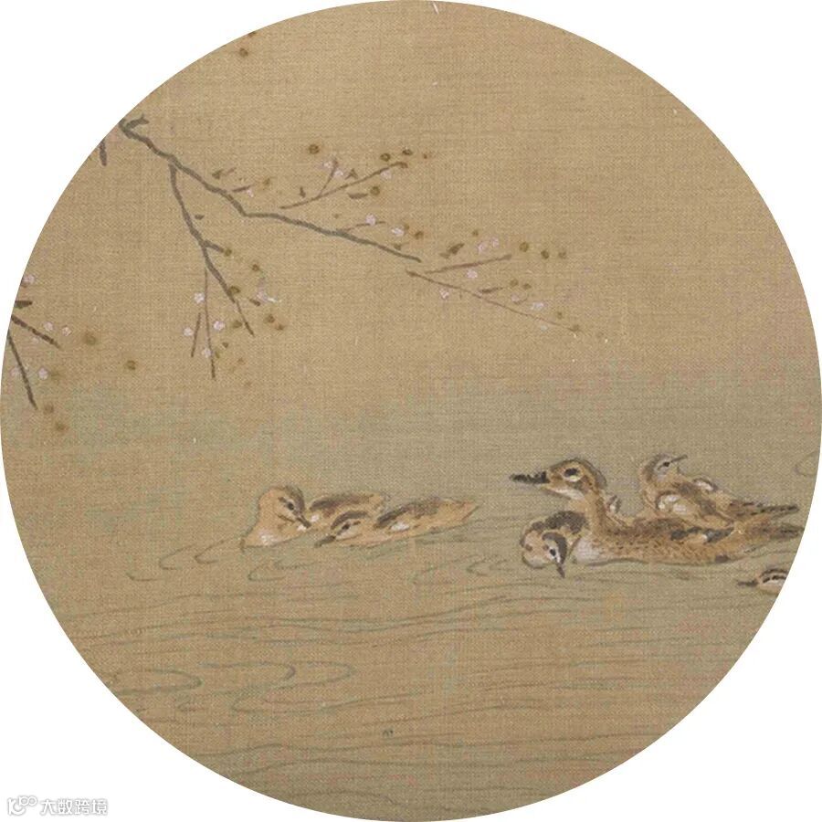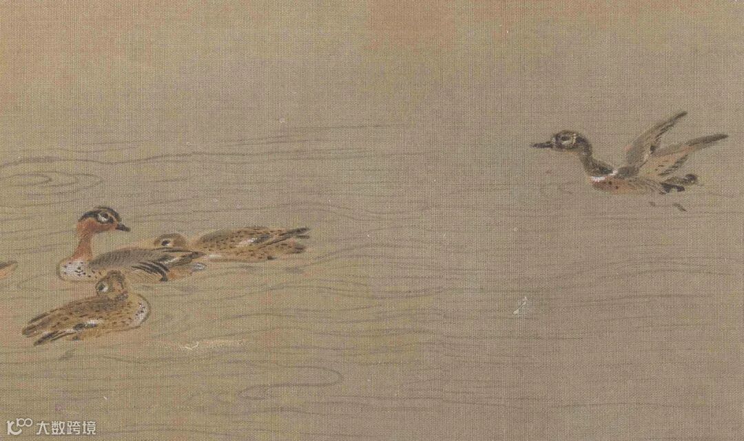 群凫左右相呼,顾盼有情。那只落在后面的野凫,惟恐自己远离伙伴,奋力鼓翅紧追而来。游在前边一只母凫,携带着五只幼雏学泳于水。其中一只幼凫卧伏母背,其余四只紧依母旁不肯轻离,宛若人间母子情爱。