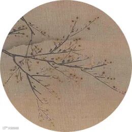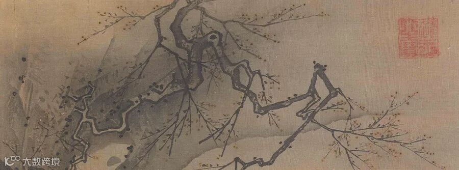 此图为花鸟小景,仅画崖石一角、春水一湾,悬壁上有盘根错节梅树两株,枝头众花凌空映水而发。