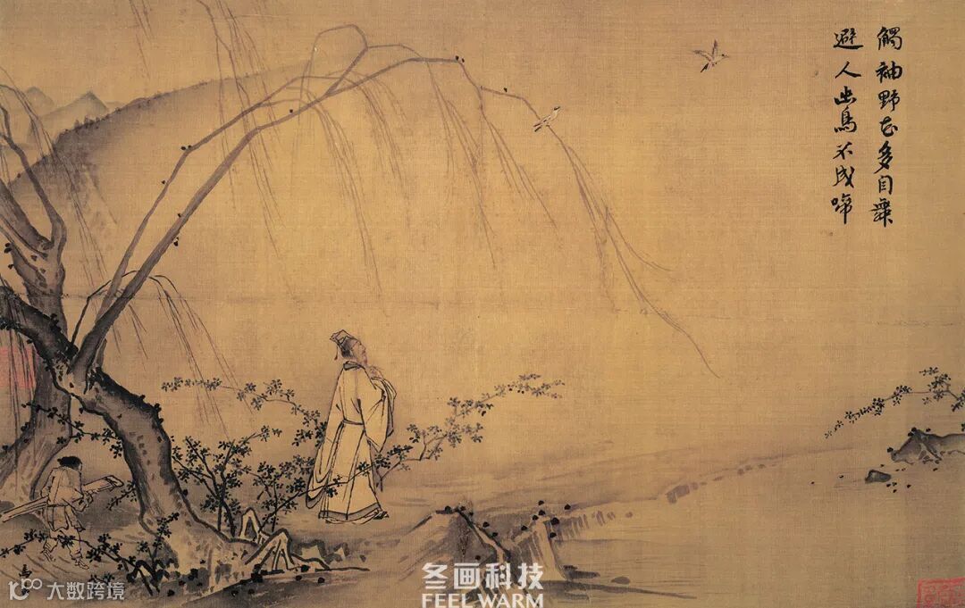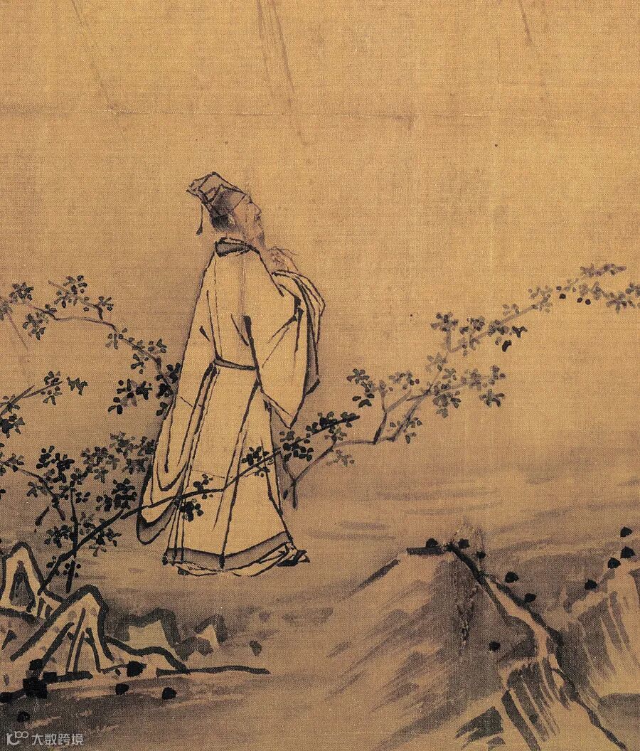 所谓空白处,透过迷蒙,难道不是辽阔?一鸟展翅于其上,与画中文人成张弛之势,中以视线相接,如弦响矢落。两鸟用笔精练,神彩俱生。人物的情态亦很生动:衣纹的笔法劲利、颤动,作钉头鼠尾勾法,线长而挺;为避免单调,又以浓墨桃花加以点破--此种桃花点,散缀于礼服周围,将其白色衬得更加鲜明、突出。