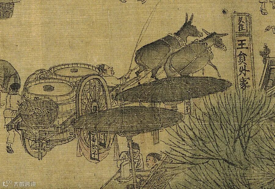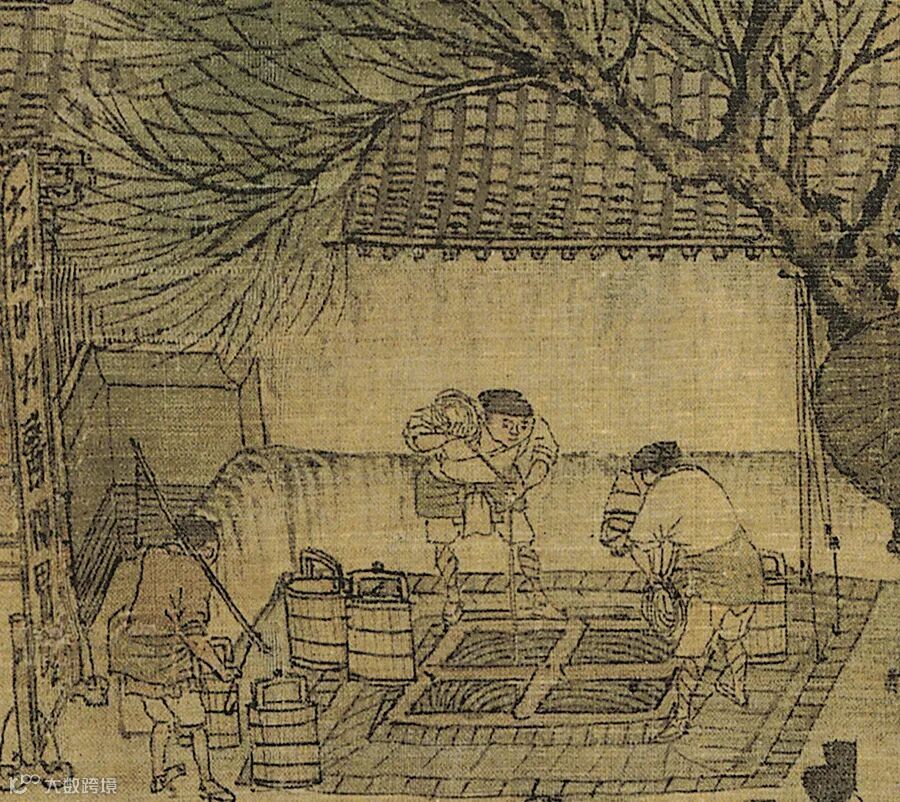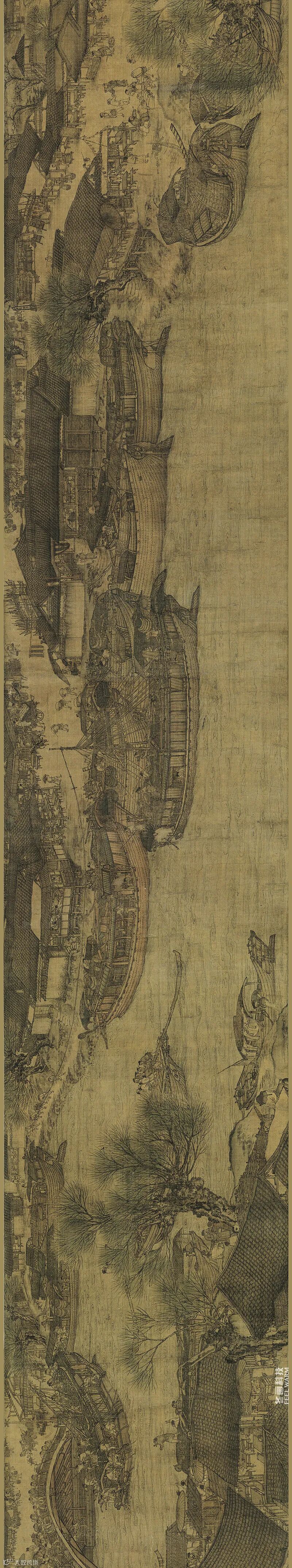 穿过一丛苍劲的老树,来到城郊的街道,人们正在从停泊在河边的粮船上搬下沉重的粮袋。水波激荡的汴河开始出现在画卷上,它渐渐成为画卷中段的主脉,一切活动都沿着汴河展开。