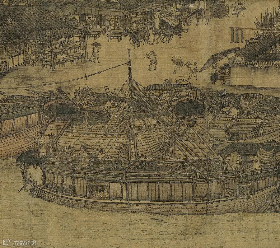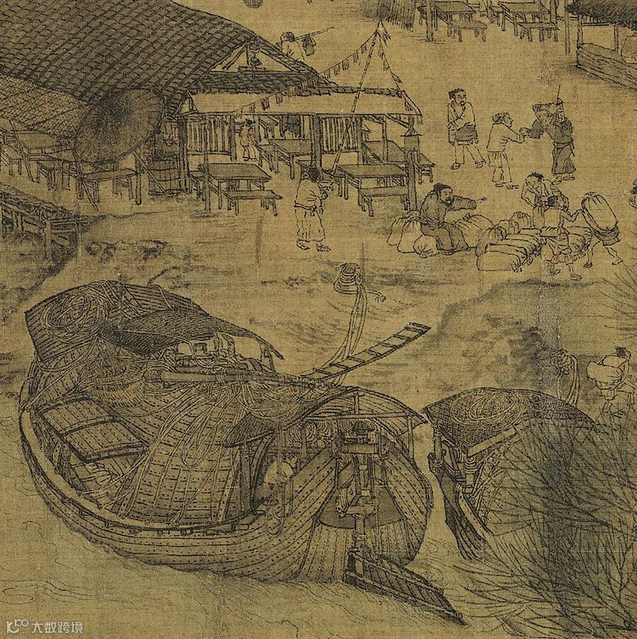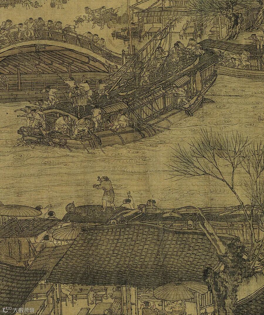 我们看到泊岸船只上悠闲的舟中生活,看到逆水行船的艄公和岸上俯身前行的纤夫行列,感受到在宋代经济生活中具有重要地位的漕运的艰辛。