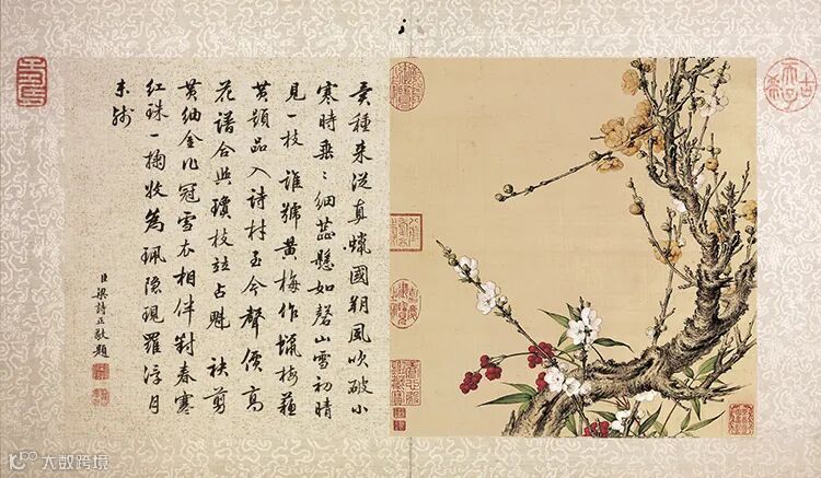 此幅出自《郎世宁花鸟图册》,每开均有乾隆朝内阁大臣梁诗正的题诗。此图册分别描绘了牡丹、兰花、荷花、梅花等艳丽多姿的花卉和体态生动的蝶、鸟。构图上取法中国传统花鸟画的格局,以虚托实,注重对所绘物象的突出。在表现技法上,则充分发挥了欧洲绘画注重明暗及透视的特点,以工致细腻的笔触,刻画出花瓣、叶片以及鸟雀的羽毛质感和体积感,呈现出与传统的中国花鸟画迥然不同的艺术风貌。这种“中西合璧”的画风成为清代宫廷绘画艺术的一大特色,受到了清皇室的青睐。