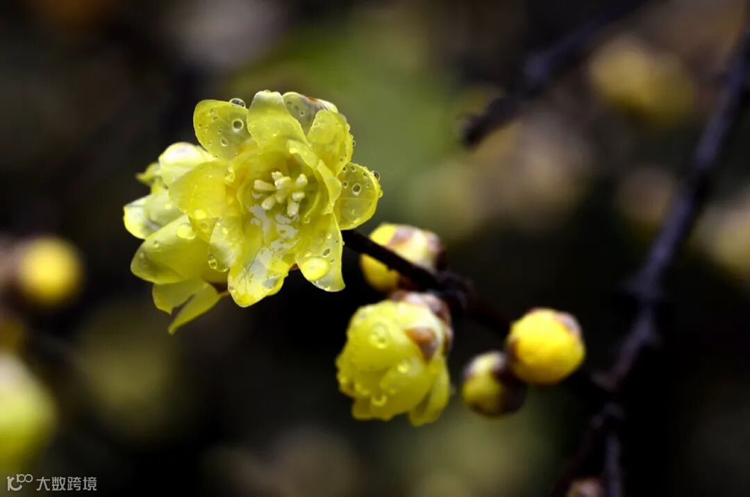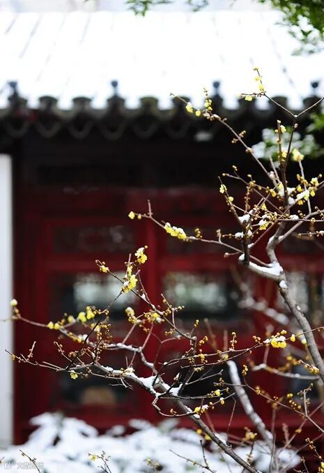 异种来从真蜡国,朔风吹破小寒时。垂垂细 蕊悬如磬,山雪初晴见一枝。谁号黄梅作蜡梅,苏黄题品入诗村。至今声价高花谱,合与琼枝并占魁。袂剪黄紬金作冠,雪衣相 伴对春寒。红珠一掬收为珮,隐现罗浮月未残。