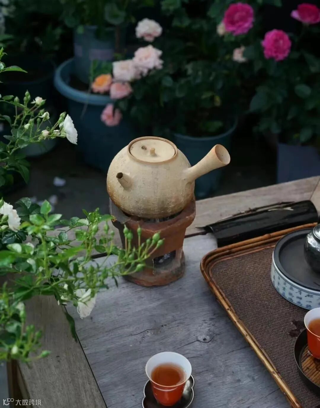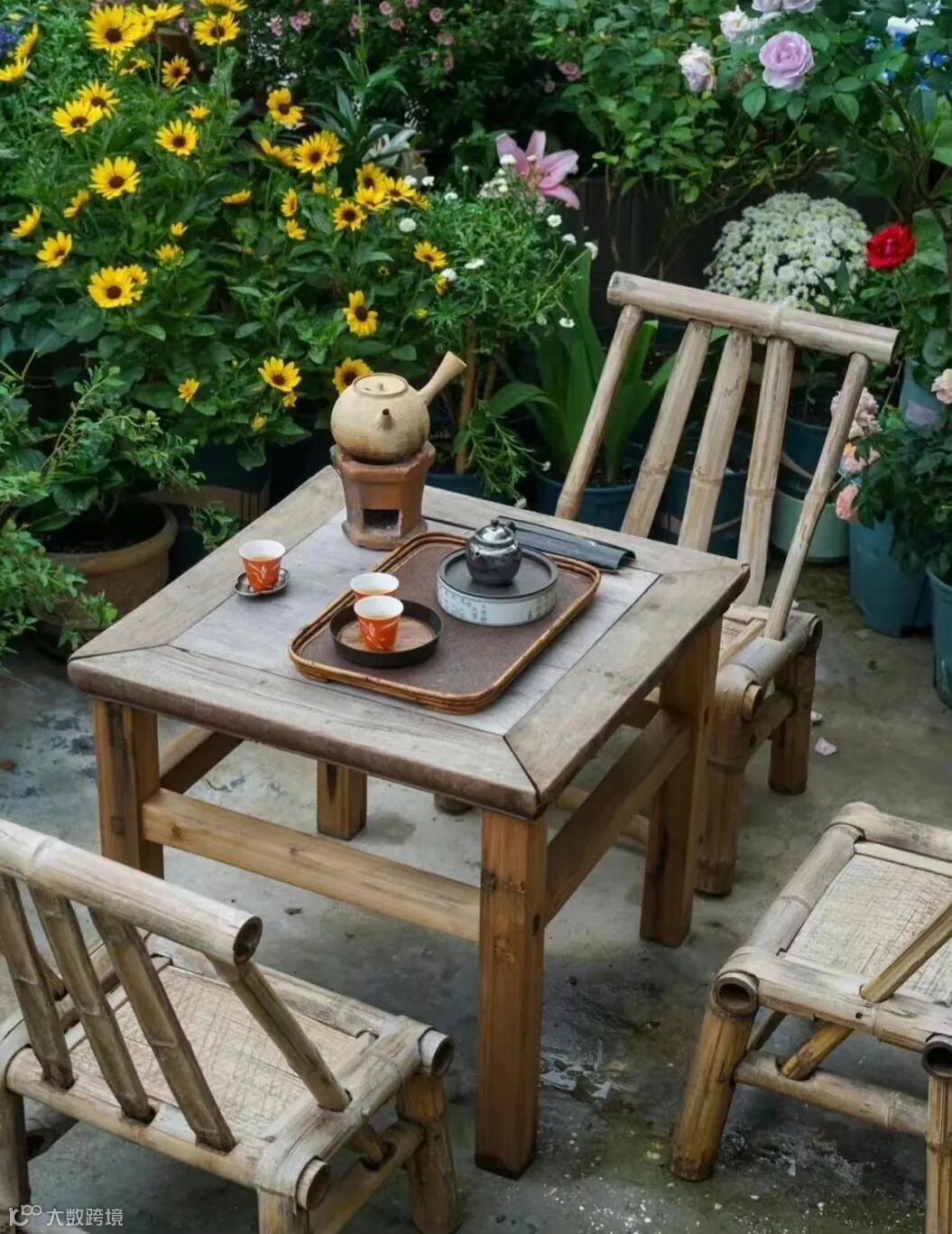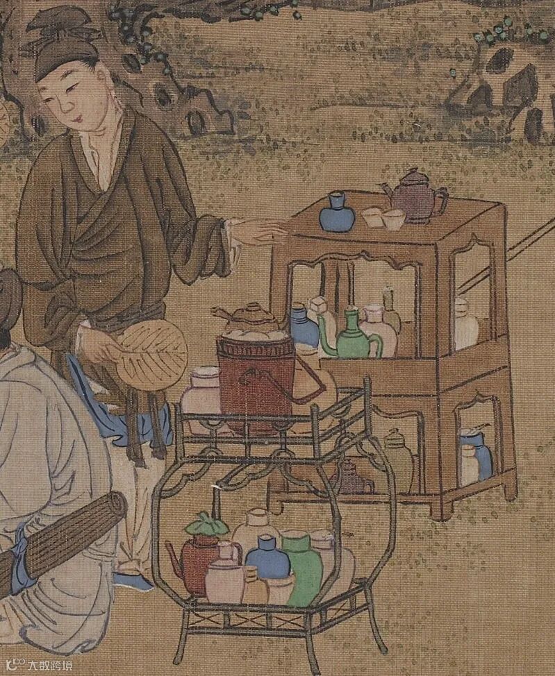 四人周围有五个架状货架,担中所装为瓷器茶具。
