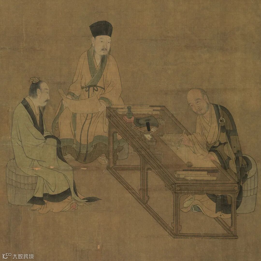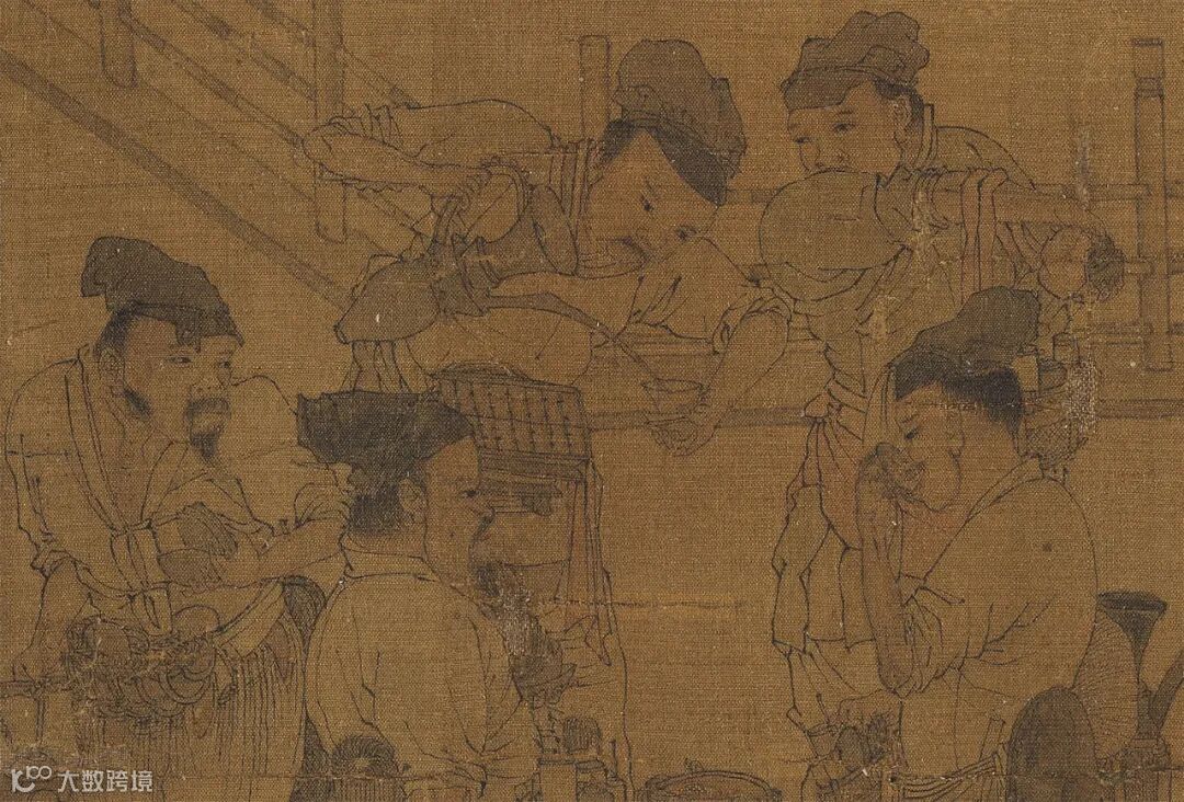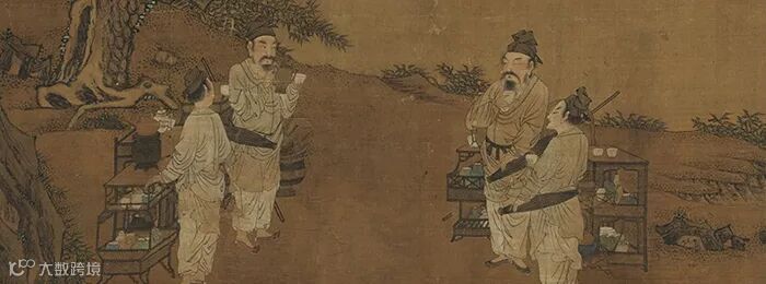 此画描绘了磨茶、点茶、挥翰、赏画的文人雅士的茶会场景。草圣怀素挥毫欲作书,学士围坐画桌旁,两位侍茶者或跨凳撵末,或执壶注茶,再现了两宋流行的点茶技艺。