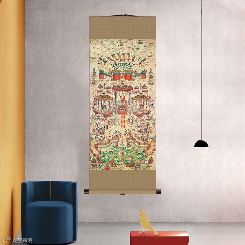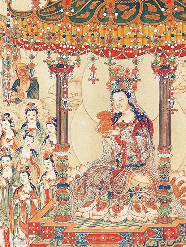 通幅《极乐世界庄严图》,人物众多,景物繁复,但通过设计者细致的安排,形成一幅结构严谨的巨作。