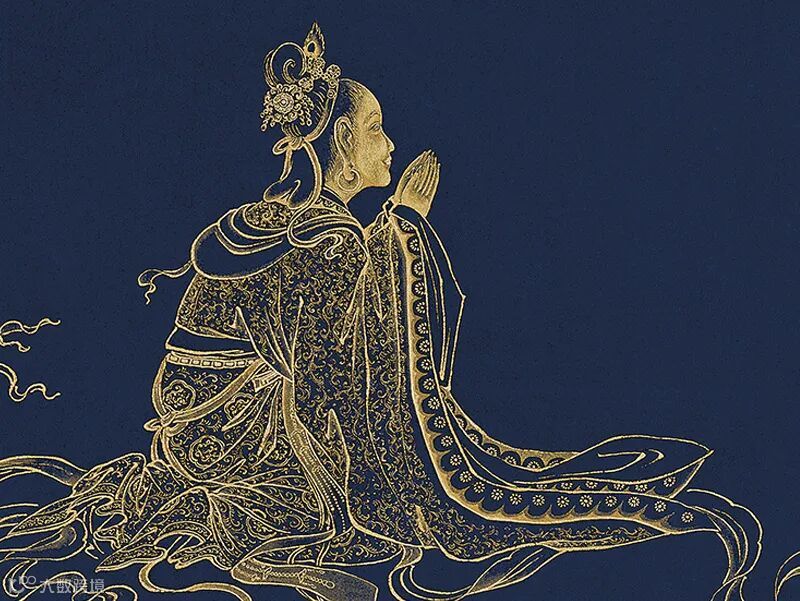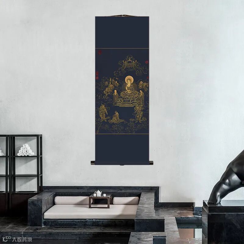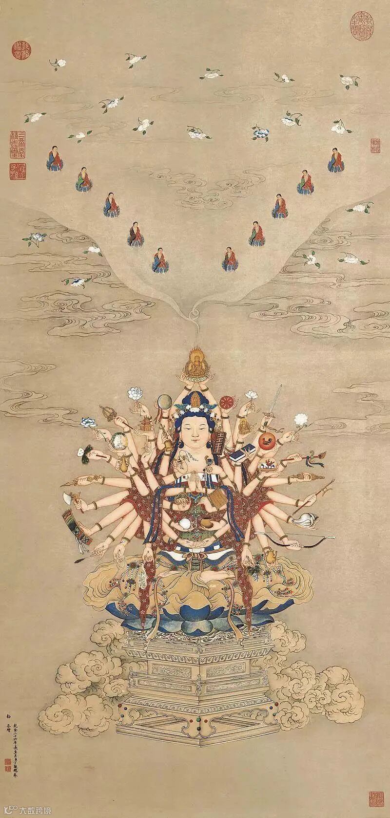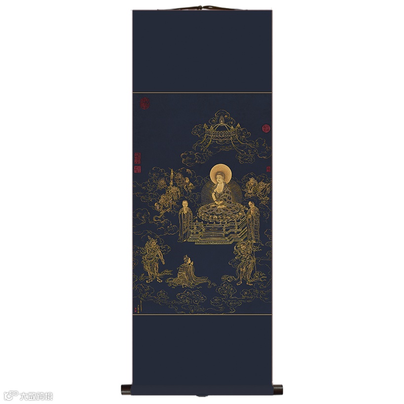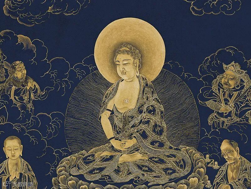 《无量寿佛》即阿弥陀佛,本图用金粉绘出的无量寿佛盘坐在莲花宝座上,四周祥云缭绕,前有女信徒合十而拜,护法天王侍于左右。