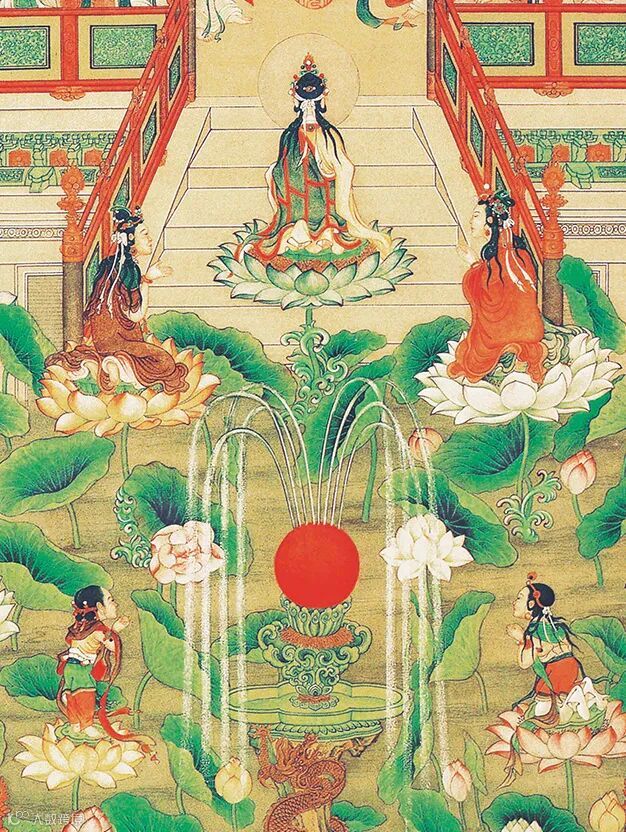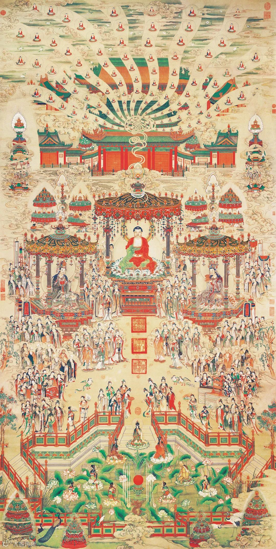 整幅画左右对称,敷色鲜艳,树木宫殿与圣众菩萨之间,虚实互补,列序有秩,将《阿弥陀经》等净土诸经所阐述的极乐世界胜妙景观,钜细靡遗地呈现出来。