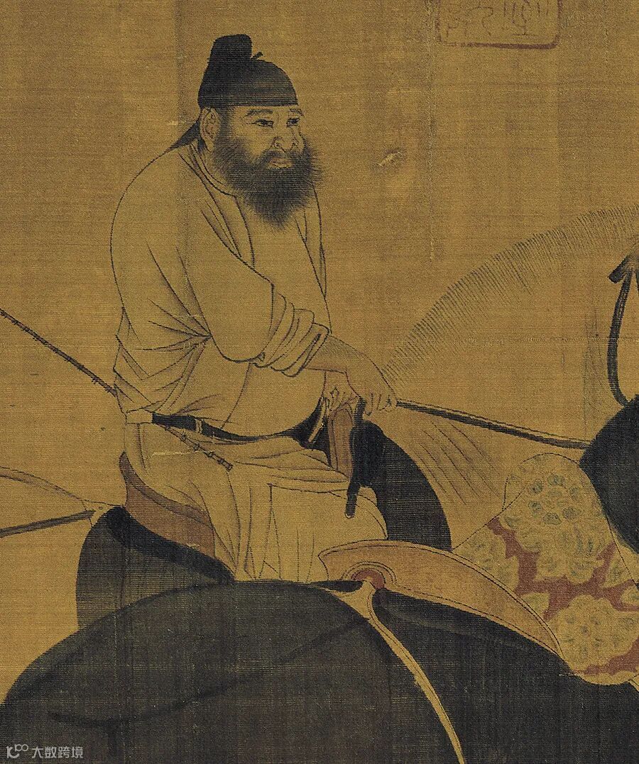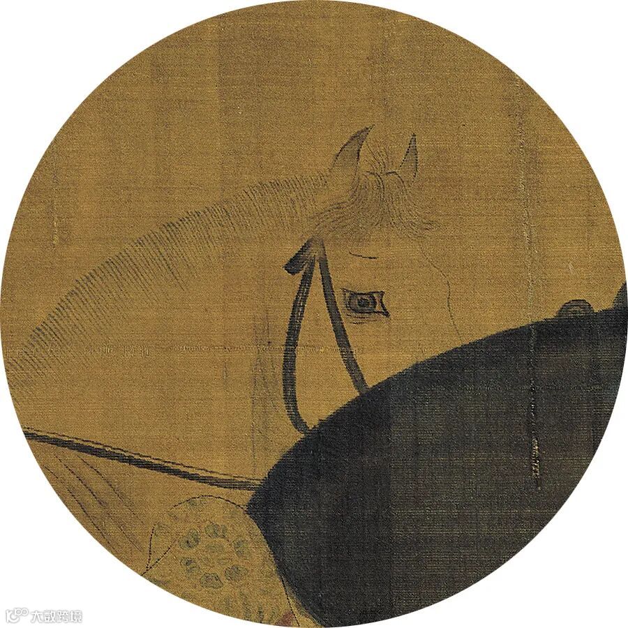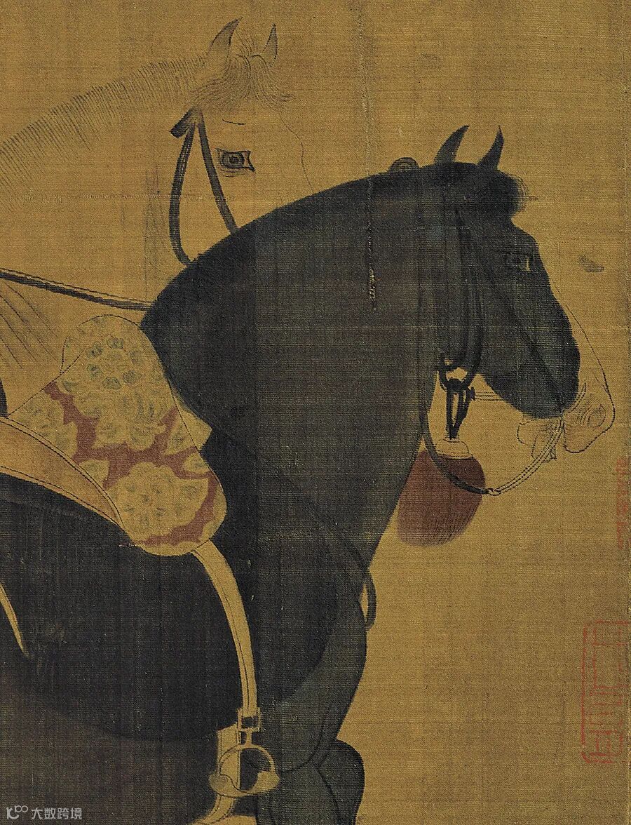 此图画一马官骑白马与另一黑马并辔缓行,背景不作任何点染。图中黑白二马的头颈、躯体、臀部、蹄腿各部分间的比例匀称,透视解剖准确。