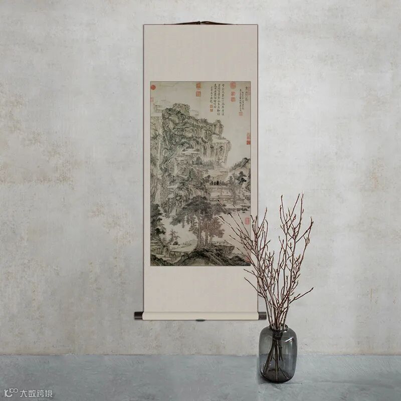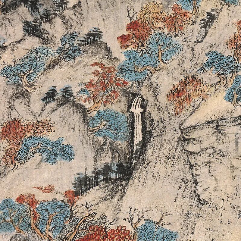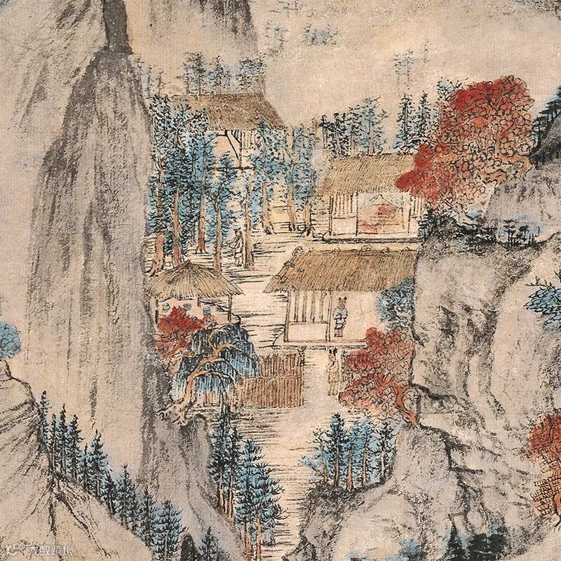此画以山水为主体,崇山峻岭,飞瀑流泉,单柯碧树,溪潭草桥,加上画中的人物,构成了一幅深秀、谨严的山水人物画。
