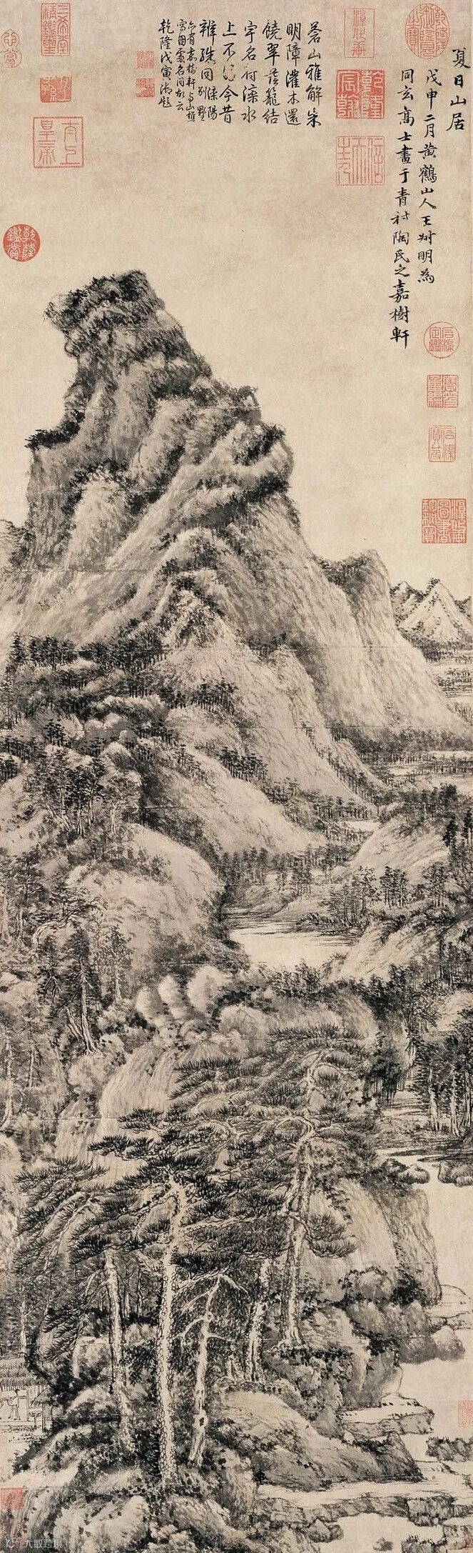 《画史绘要》中说:"王蒙山水师巨然,甚得用墨法"。而恽南田更说他“远宗摩诘(王维)”。