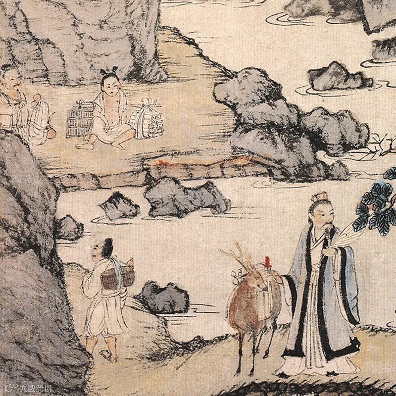 这幅画描绘了晋代道士葛洪携家移居罗浮山修道的情景,画中葛洪手执羽扇,身着道服,神态安详,正回首眺望,身后老妻骑牛抱子,一仆牵牛而行。