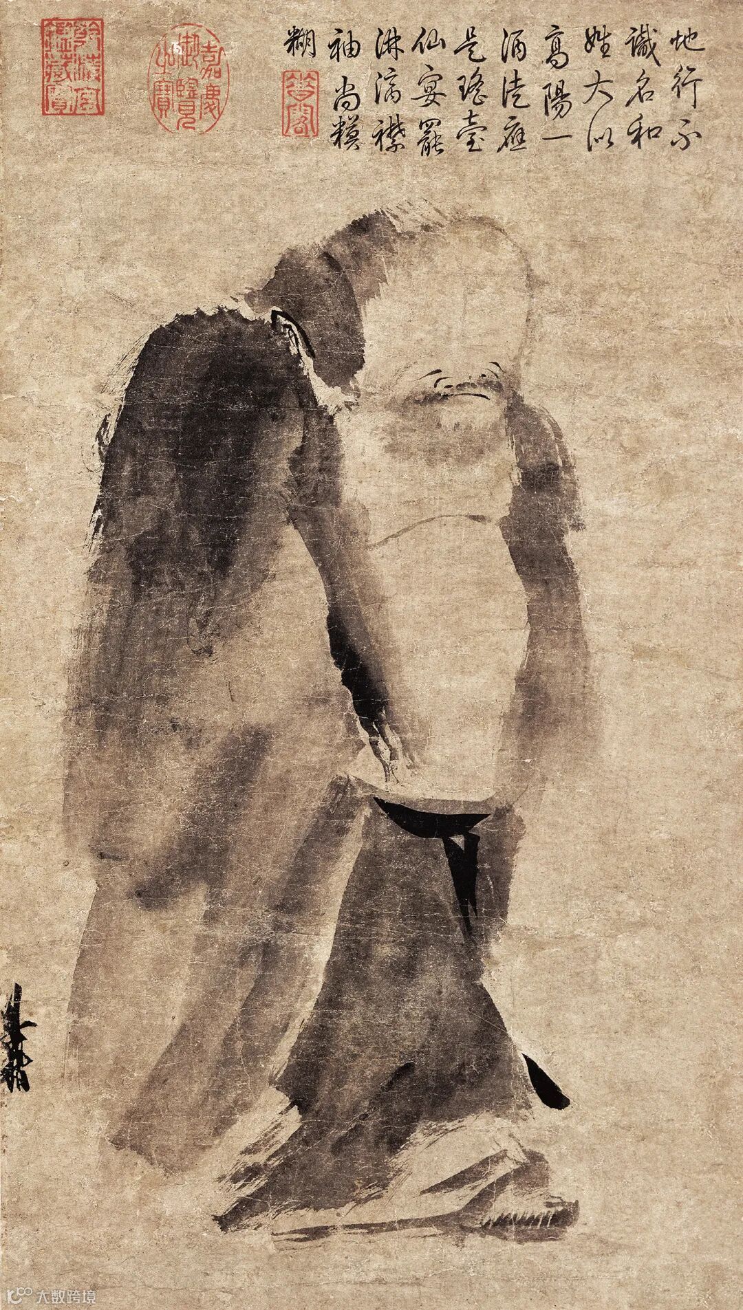 《泼墨仙人图》画面上的形象是一位袒胸露怀的“仙人”,宽衣大肚,步履蹒跚,憨态可掬,像是行走在云雾之中,其脸部的眉、眼、鼻、嘴拥成一团,下巴胡子邋遢,似乎形象很猥琐,但却是 尽脱俗相,透出傲骨的仙气。