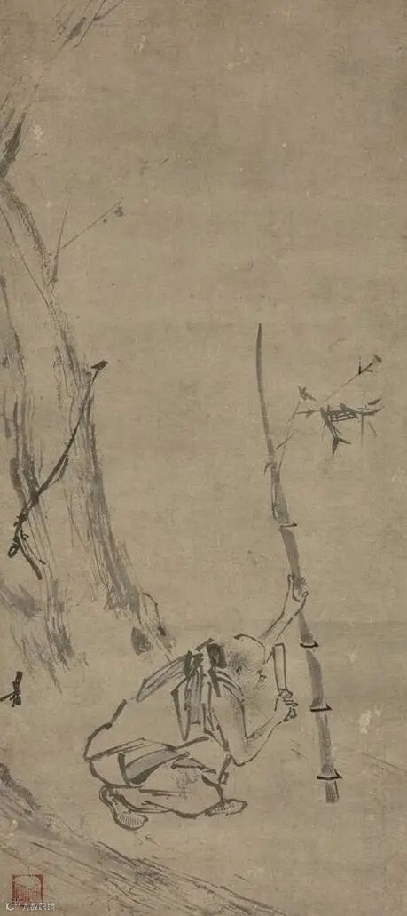 《六祖斫竹》表现的就是惠能在劈竹的过程中"无物于物,故能齐于物;无智于智,故能运于智"。梁楷的《六祖斫竹》是其中年以后的作品,笔墨极为粗率。笔笔见形,笔路起倒,峰回路转,点染自如;欲树即树,欲石即石,"心之溢荡,恍惚仿佛,出入无间"。梁楷似乎也参弹入画,视画非画了。