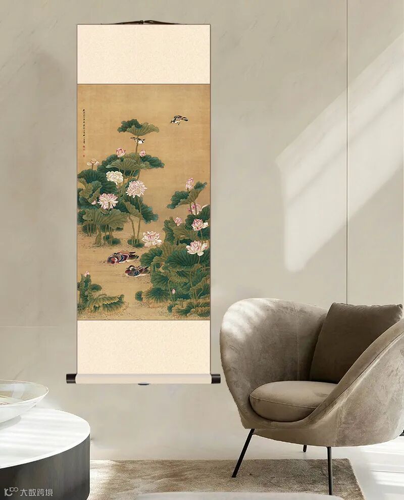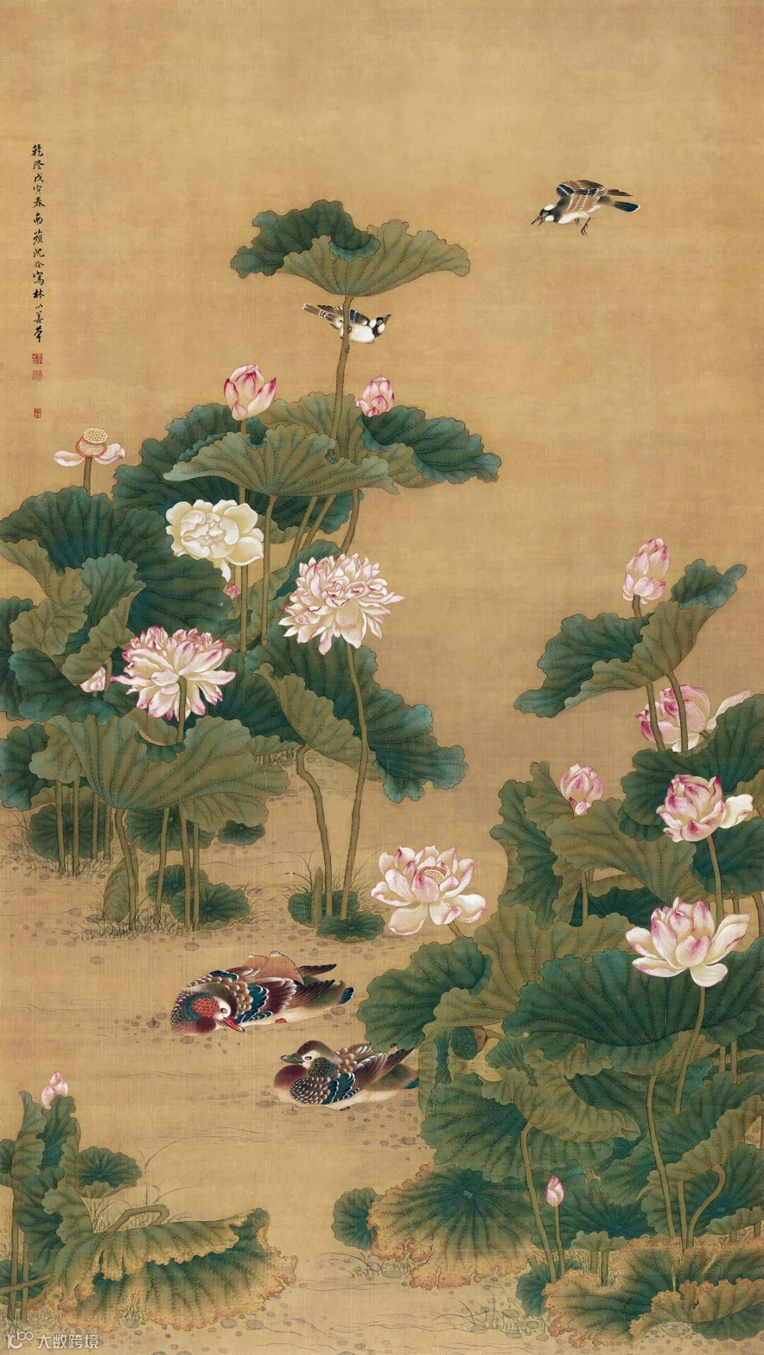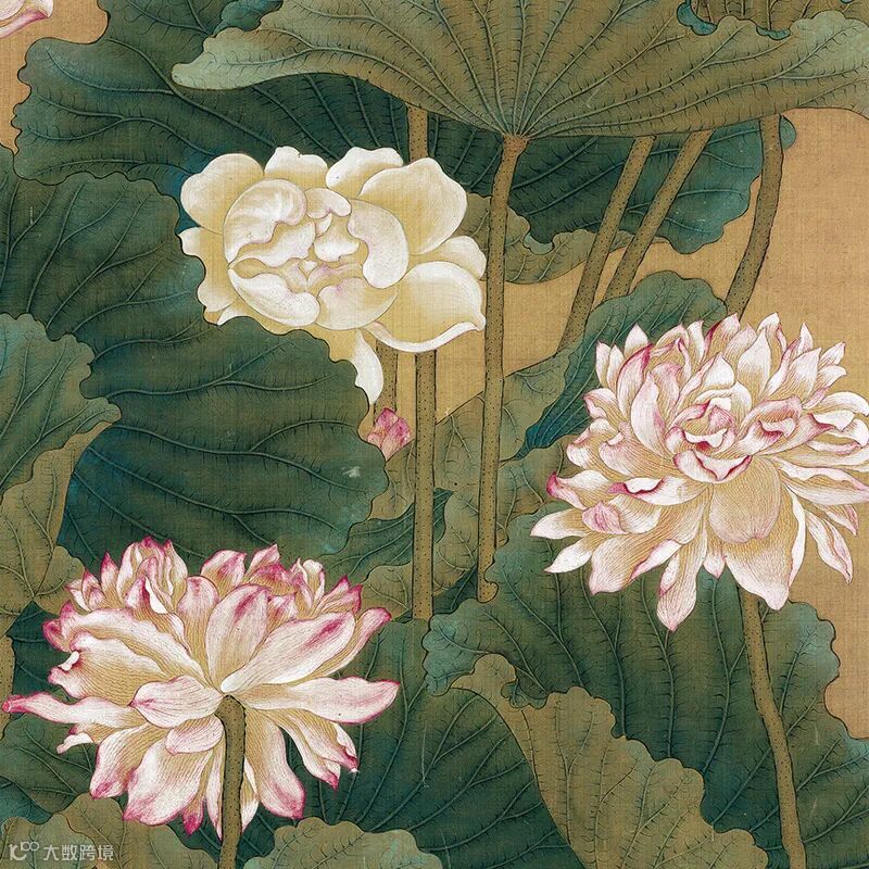 《荷花鸳鸯图》绘春夏之季池塘美景,荷叶茂盛如幂,老嫩枯荣,随风飞舞,翻翔滴翠。莲花枝枝高卓,摇曳生姿;朵朵饱满,粉妆玉琢。或极绽怒展,或含苞待放。