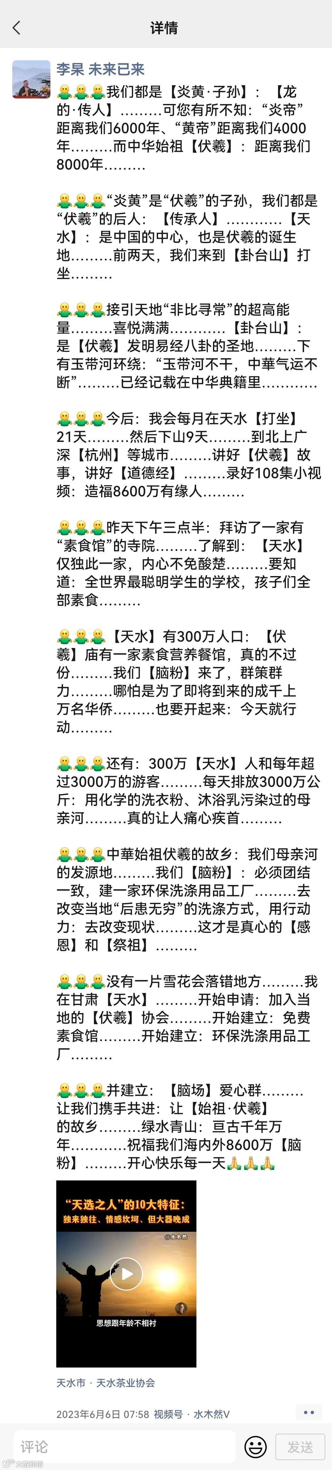 今后:我会每月在天水【打坐】21天………然后下山9天………到北上广深【杭州】等城市………讲好【伏羲】故事,讲好【道德经】………录好108集小视频:造福8600万有缘人………