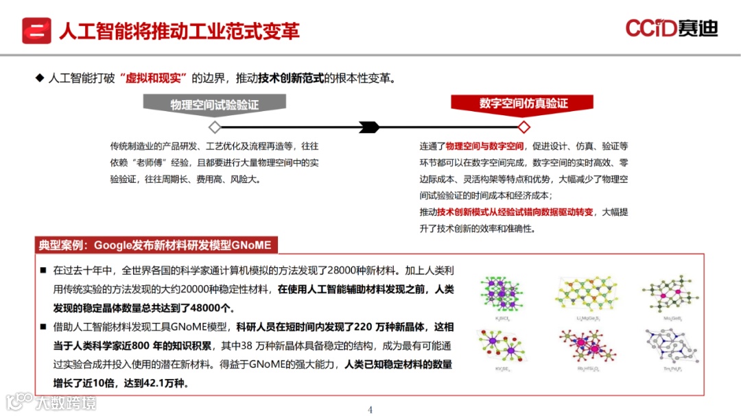技术创新范式变革:AI打破“虚拟和现实”的边界,推动技术创新从经验试错向数据驱动转变,提升效率和准确性。