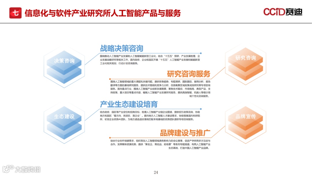 研究咨询:提供基础研究和专项咨询服务,聚焦人工智能产业创新发展,编制产业发展研究报告。