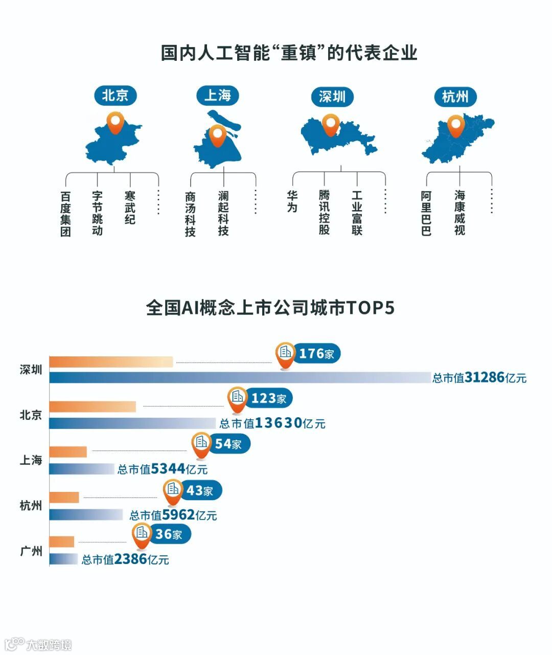 从我国人工智能产业链的区域分布来看,主要集中在北京、上海、广东、浙江等地,北京拥有百度集团、字节跳动、寒武纪等龙头企业,上海有商汤科技、澜起科技等代表性企业,深圳有华为、腾讯控股、工业富联等领军企业,杭州则有阿里巴巴、海康威视等知名科技巨头。
