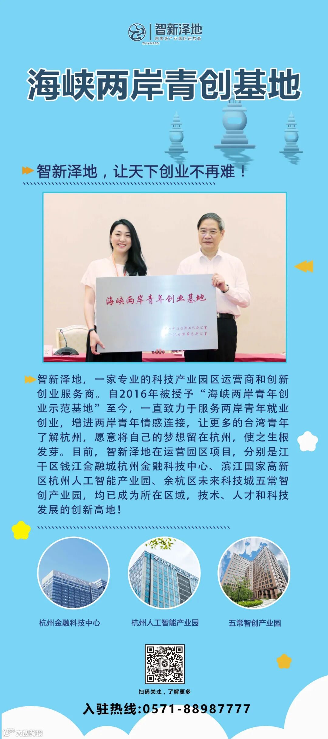 智新泽地,是一家专业的科技产业园区运营商和创新创业服务商。自2016年被授予“海峡两岸青年创业基地”以来,一直致力于服务两岸青年就业创业,增进两岸青年情感连接,让更多的台湾青年了解杭州,愿意将自己的梦想留在杭州,使之生根发芽。